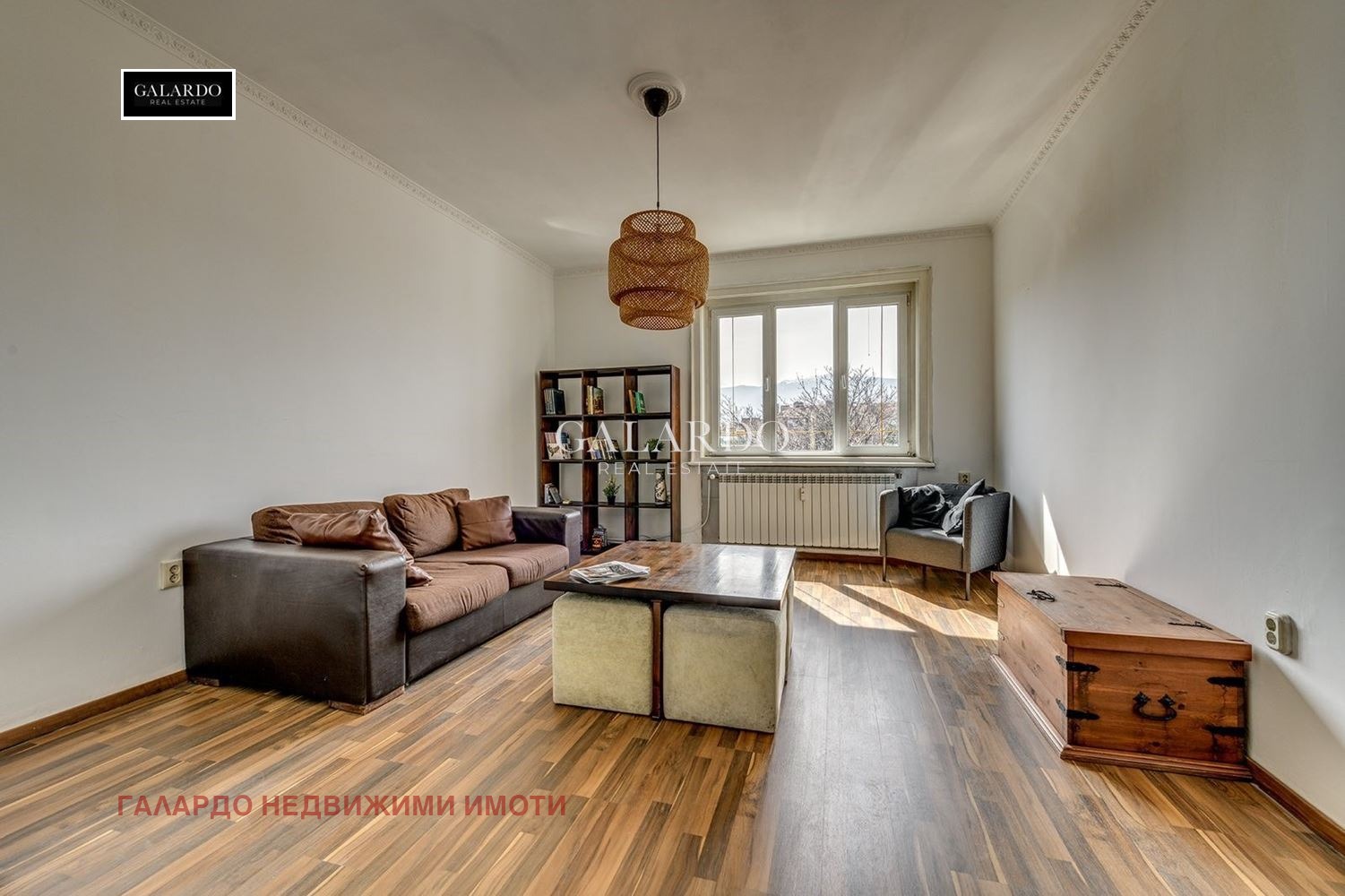 Апартаментът е с площ от 113 кв.м. и е разположен на пети етаж на сградата. Имотът впечатлява с простор, високи тавани и функционално разпределение входно антре, вестибюл с кухненска част, хол, три самостоятелни стаи, баня с тоалетна, тоалетна, 2 балкона. Южното изложение на всекидневната и голямата спалня осигуряват естествена светлина през целия ден, а гледките към тих вътрешен двор със зеленина и Витоша създават усещане за спокойствие в самия център на града.