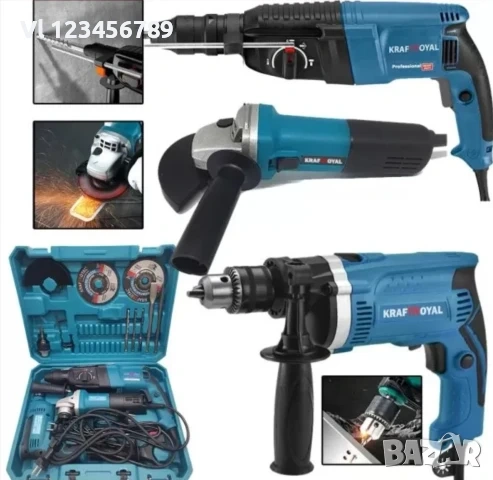 Комплектът електроинструменти KraftRoyal е универсален и ефективен комплект, който ще ви помогне с различни работни проекти. Всеки инструмент се захранва от 220 V мрежа, което ви дава мощността, от която се нуждаете, за да завършите задачите.
