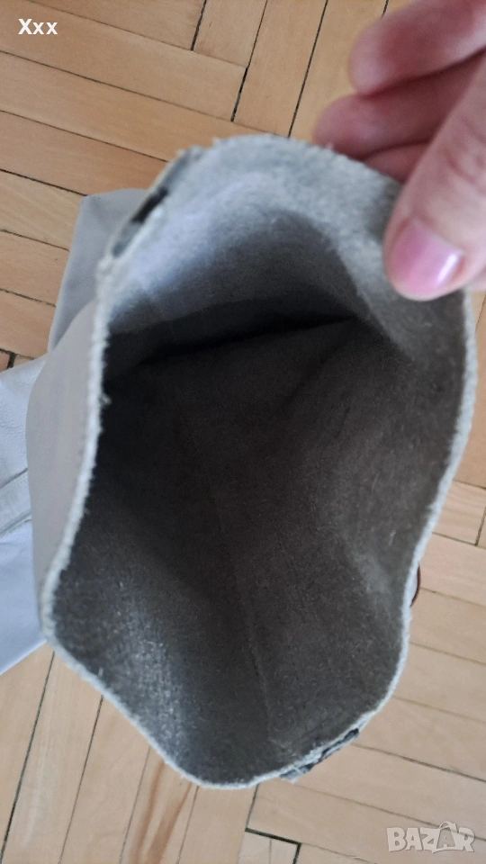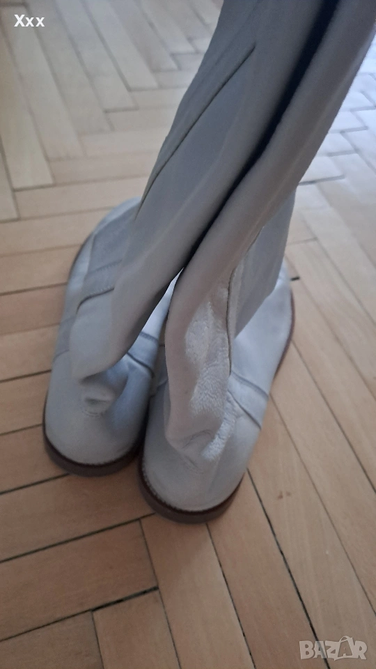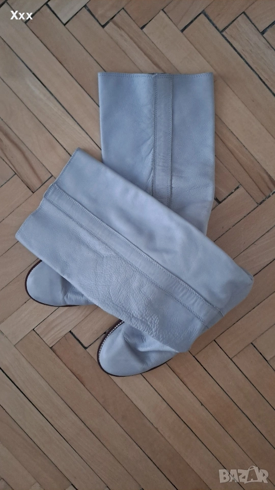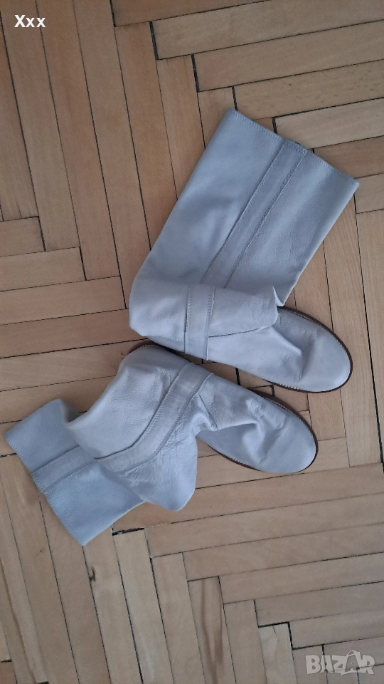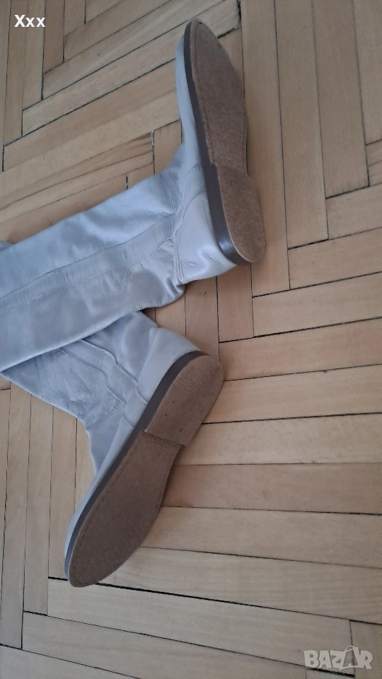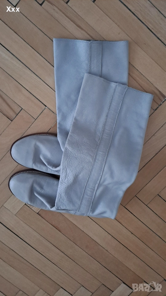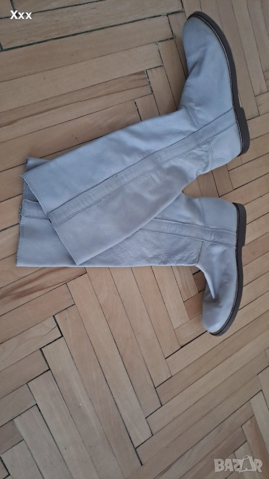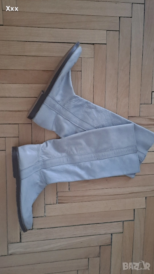 Сиви ботуши от Естествена кожа, номер 39, стелка 25 см. Могат да станат и за 38 номер с чорап. Височина с подметката - 42 см. Ширина 35 см. Стоят уникално с всякаква визия, особено с рокли, поли. Нови, само седят и не ги нося. Пробвани единствен път, не са носени навън, личи по подметката.