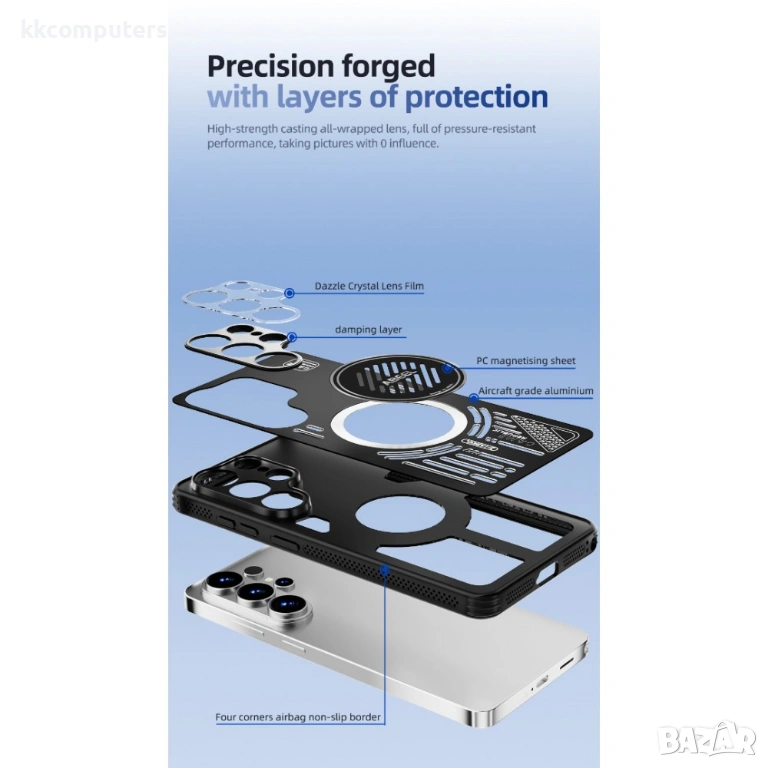 Аерокосмически алуминий с PC + TPU: Изработен от премиум матов алуминий, съчетан с PC и TPU, осигуряващ отлична топлопроводимост и модерен дизайн.
