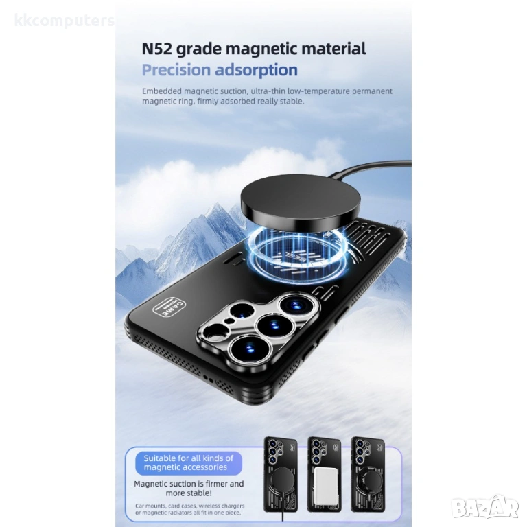 Мощна N52 магнитна адсорбция: Вграденият N52 магнитен пръстен гарантира силно и стабилно закрепване към безжични зарядни, магнитни стойки и аксесоари.