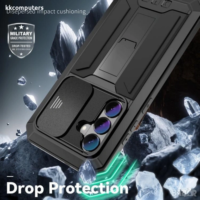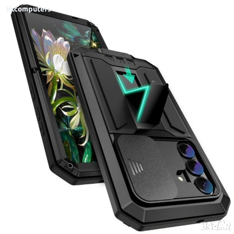 Потребители на Samsung Galaxy S26 5G, които търсят здрав, механичен калъф с IP54 защита; хора, работещи в тежки условия или занимаващи се с outdoor дейности; всеки, който цени металната конструкция, плъзгащото се капаче за камера и многофункционалната стойка.