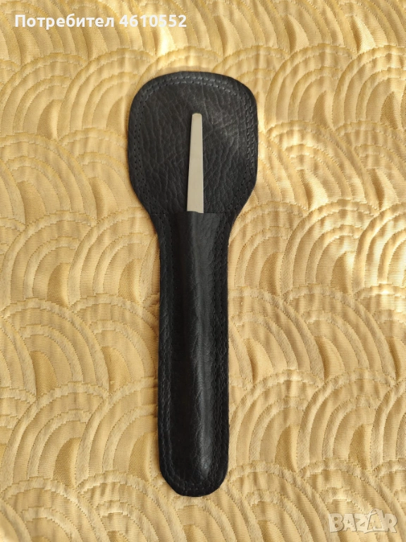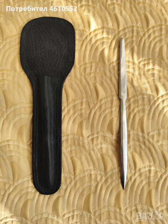 Продавам нов метален нож за рязане на хартия с кожен черен калъф. Подходящ за прецизно рязане на хартия, картон и други материали. Дължина 21см.