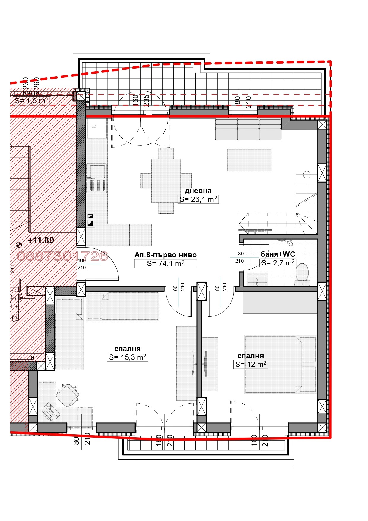 АПАРТАМЕНТ 8 на пети и шести архитектурен етаж, кота + 11,80 и 14,60 , със застроена площ 74,10 кв.м. на първо ниво, състоящо се от: дневна с кухня, две спални, баня с тоалетна, тераса и балкон, и 64,10 кв.м. на второ ниво, състоящо се от: две спални, кабинет, баня с тоалетна, тераса и балкон, заедно с изба 8 с площ 11,80 кв.м. , ведно с 15,609 % ид.ч. от общите части на сградата, както и 33,25 кв.м. от прилежащия терен.