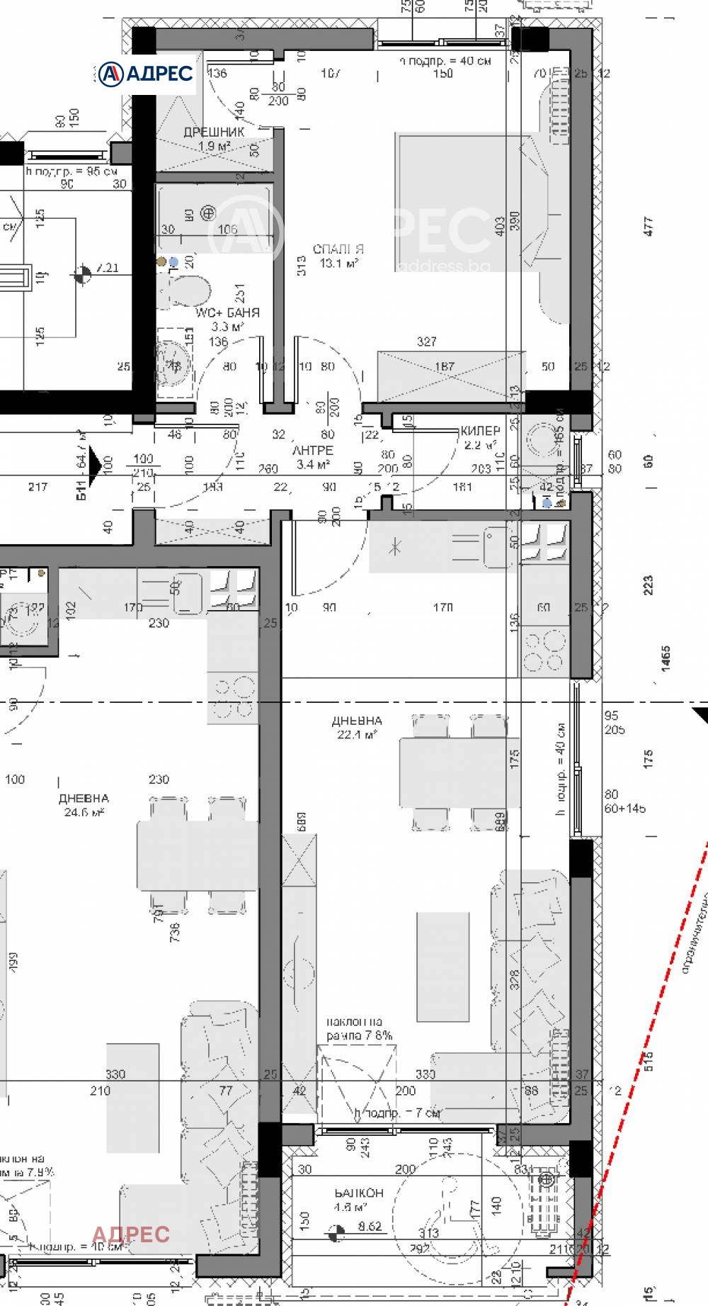 Големи площи, няколко сервизни и мокри помещение към всеки един апартамент.