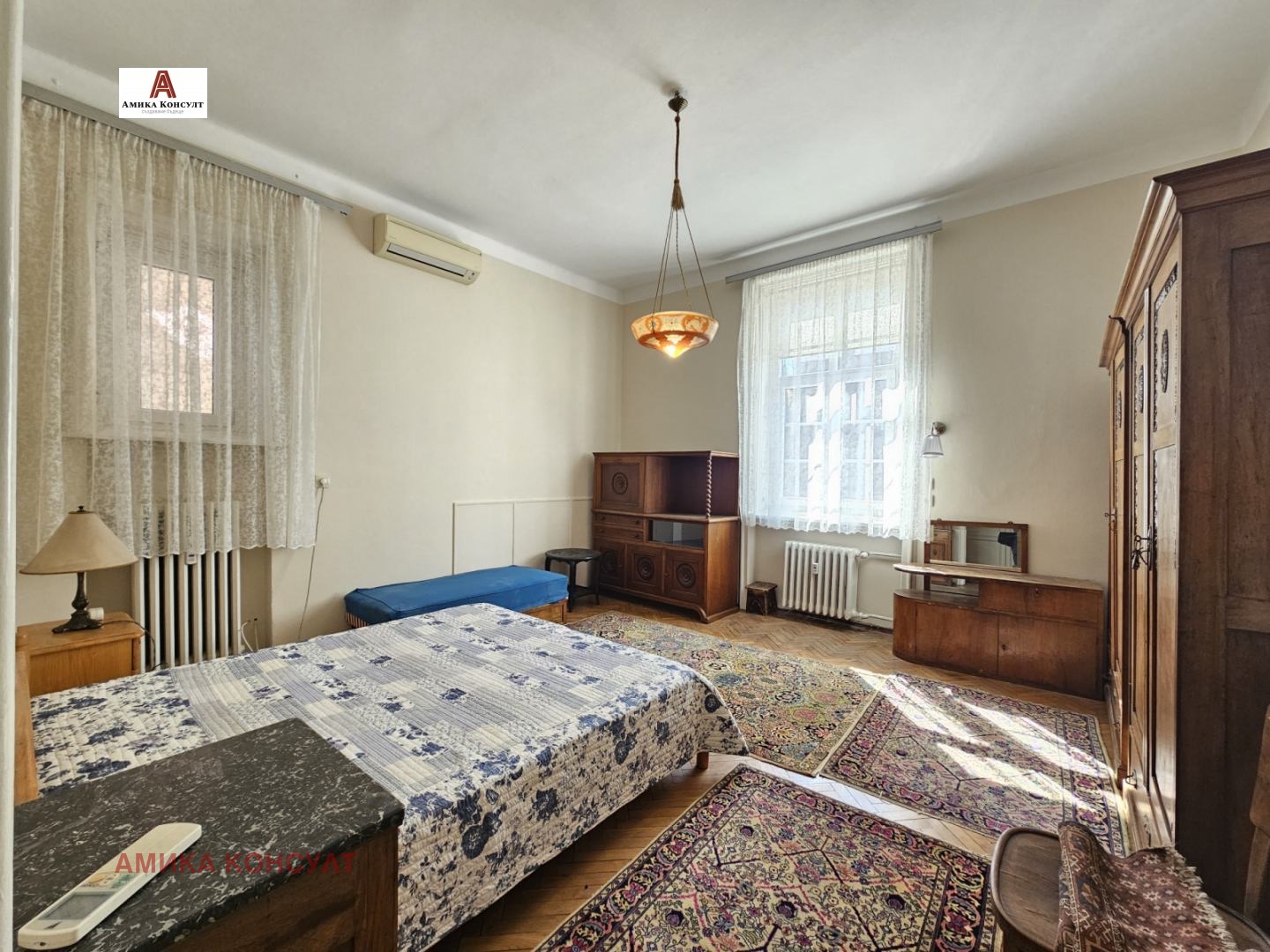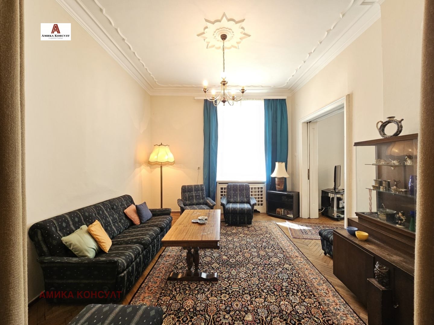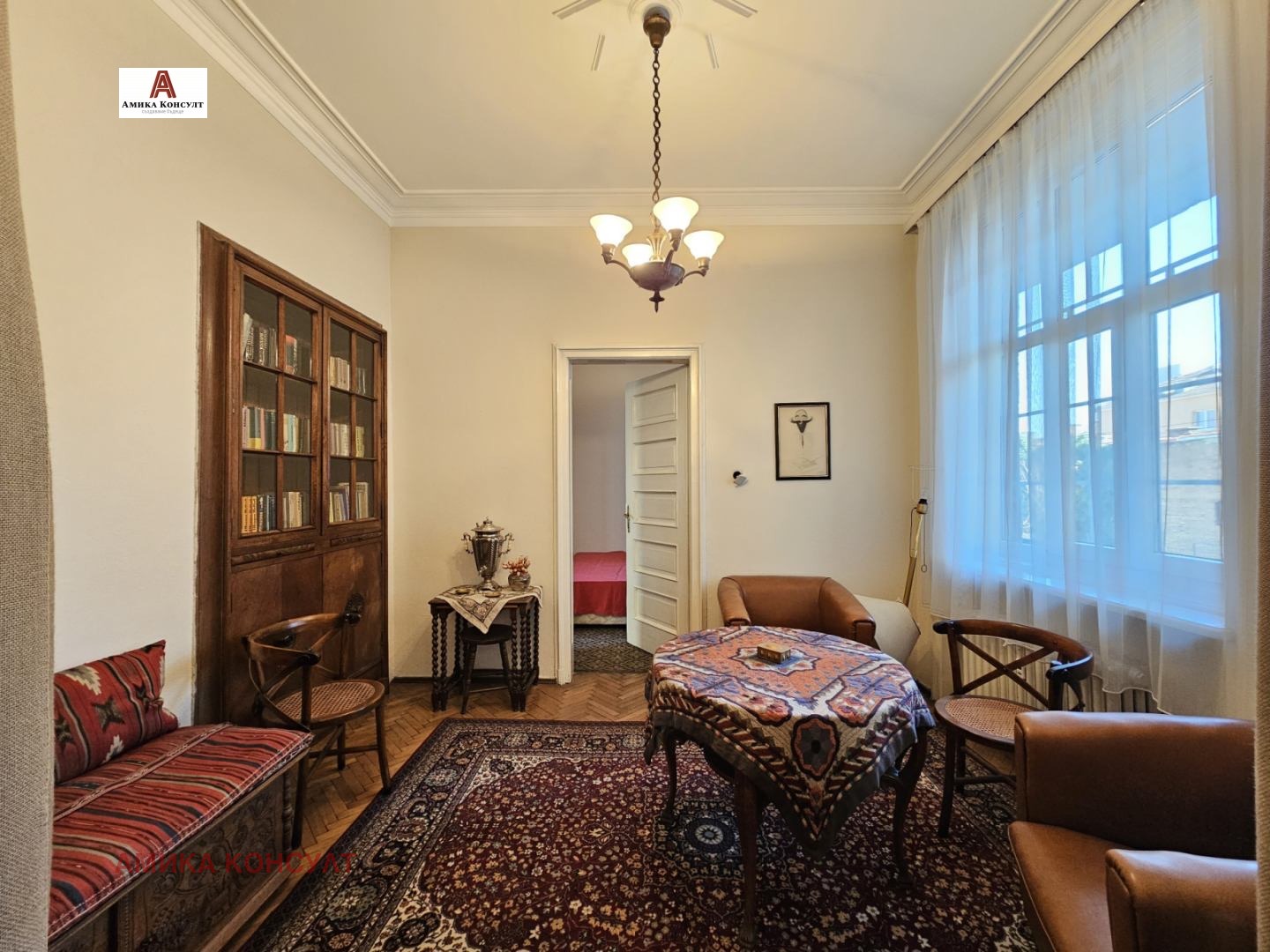 Амика Консулт представя просторен многостаен етаж от къща в сграда паметник на културата, след внимателен ремонт със запазена автентична архитектура и атмосфера. Проектирана е от известните архитекти Иван Васильов и Димитър Цолов, чиито големи творби са сградата на Българска Народна Банка, проектът за възстановяване на църква Св. Неделя , Националната библиотека и други.
