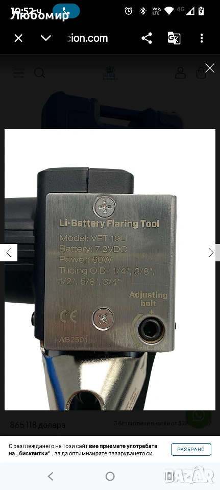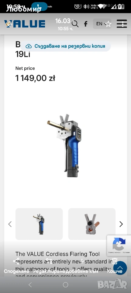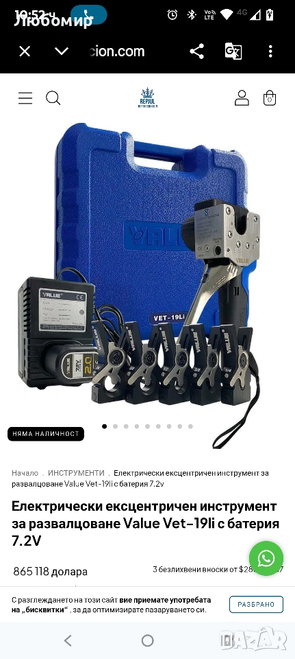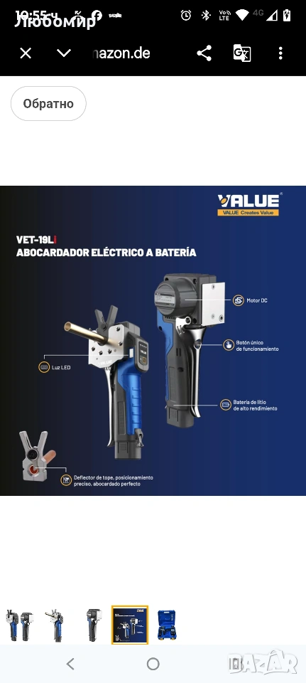 Електрически инструмент за развалцоване Value VET-19LI с куфар
