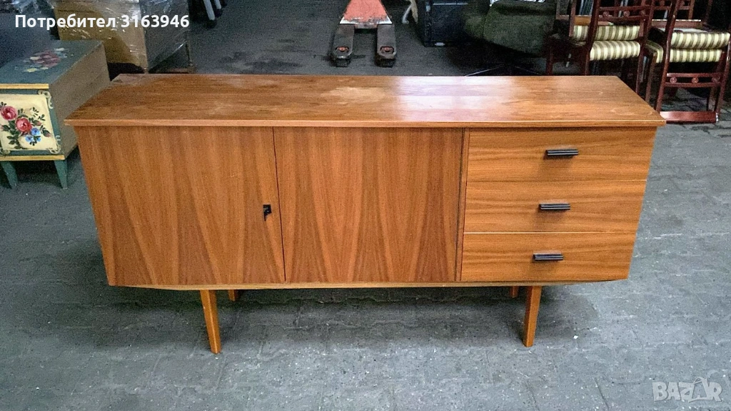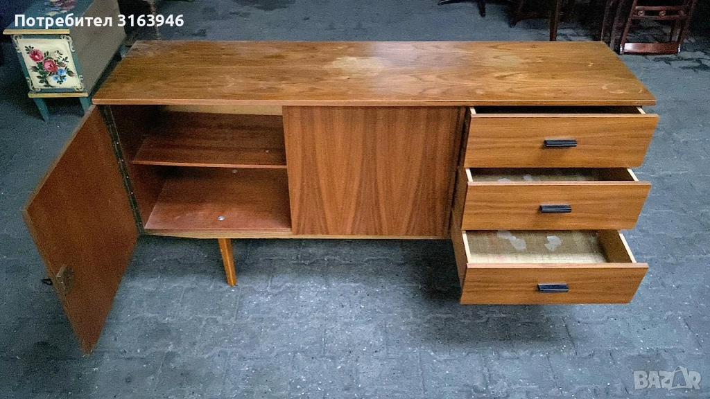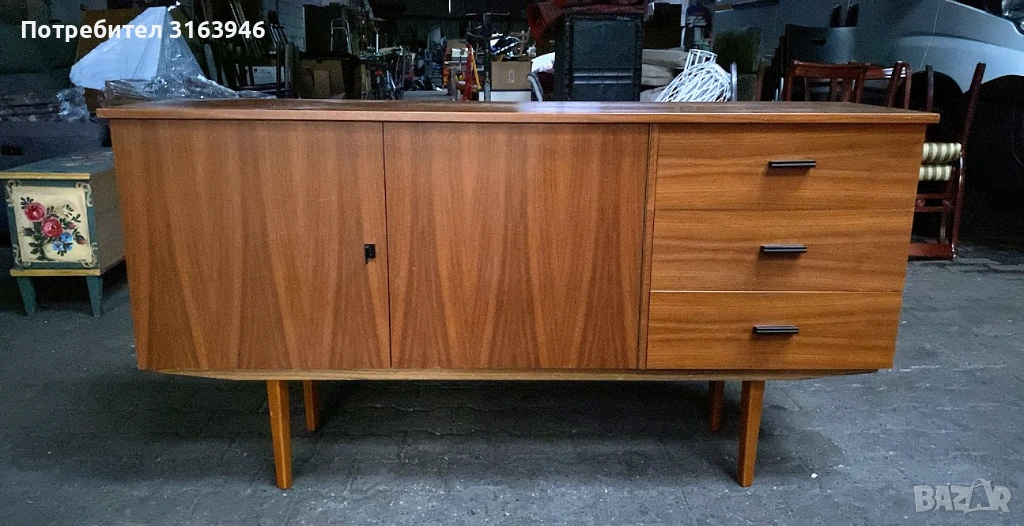 Елегантен винтидж шкаф с изчистен силует и характерен дизайн от средата на XX век. Моделът съчетава практично разпределение – шкаф с вратичка и отделение с чекмеджета – с топъл дървесен фладер и високи конусни крака, типични за епохата. Подходящ както за съхранение, така и като акцентен мебелен елемент в интериора.