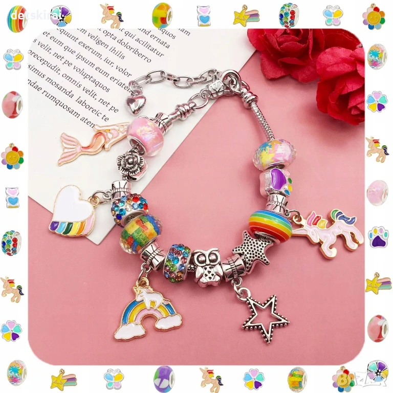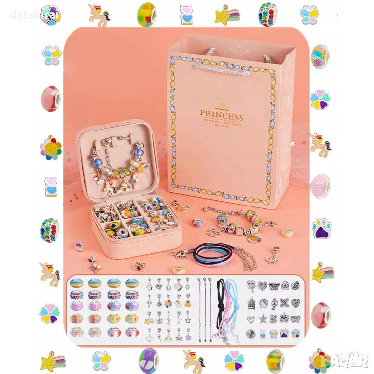 Комплектът насърчава фината моторика и чувството за естетика, докато детето избира и подрежда различните гривни с талисмани и мъниста. Всяко създадено бижу ще бъде уникално и лично.