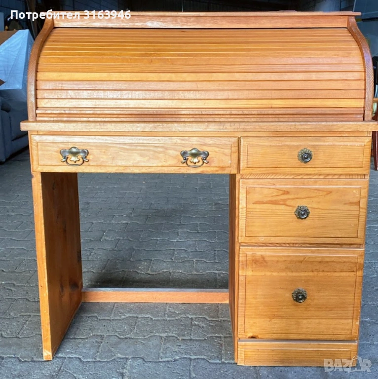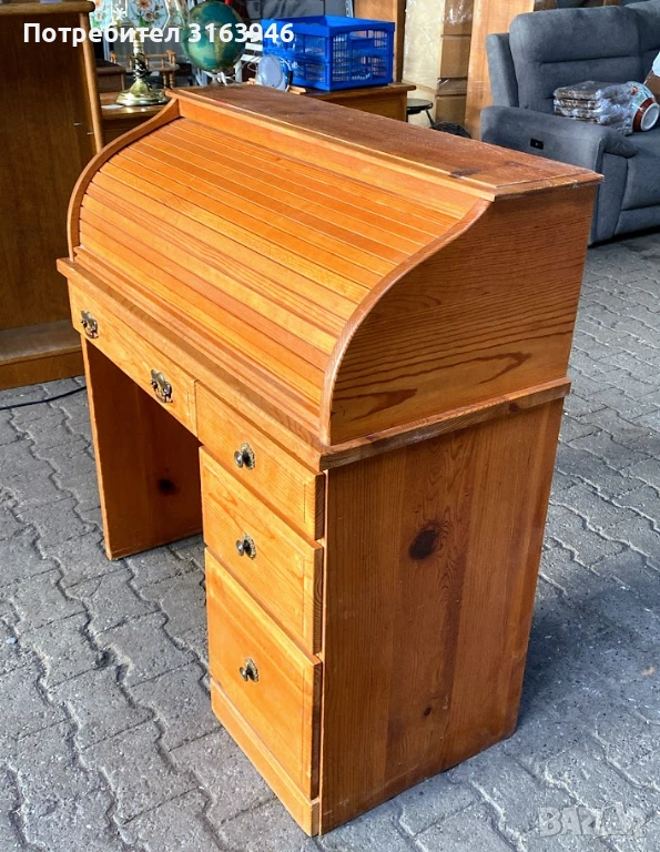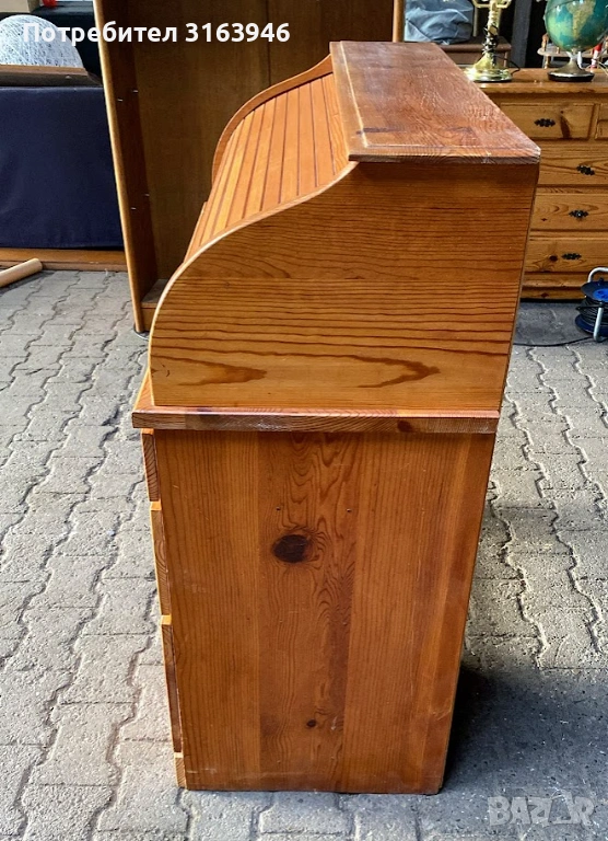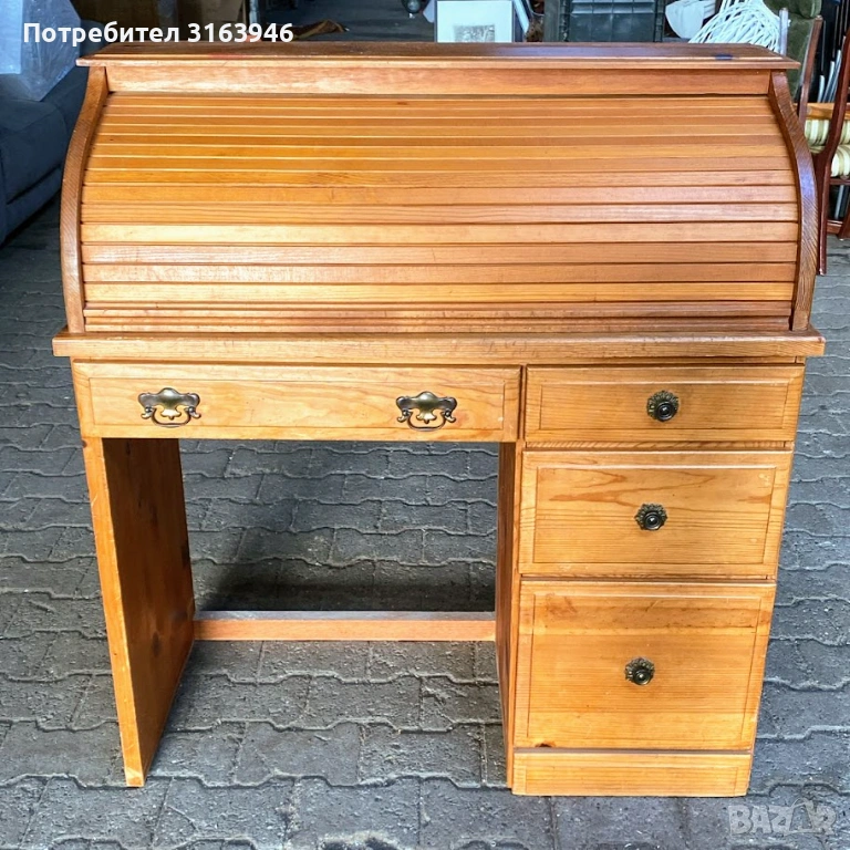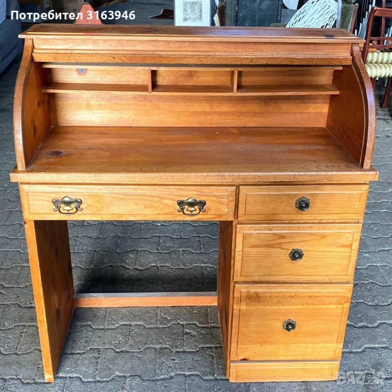 Масивно дървено писалище с рол капак, който се плъзга плавно и разкрива вътрешни отделения за документи и принадлежности. Моделът разполага с чекмеджета от дясната страна и допълнително чекмедже под работния плот. Конструкцията е стабилна, а естественият фладер на чамовото дърво придава топъл и автентичен вид.