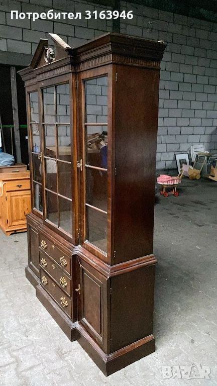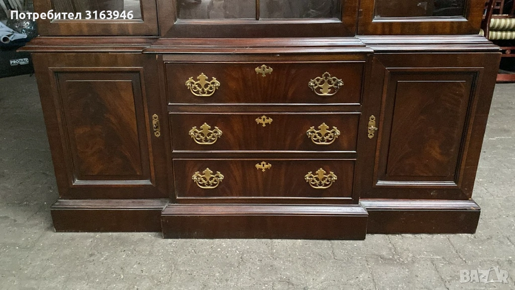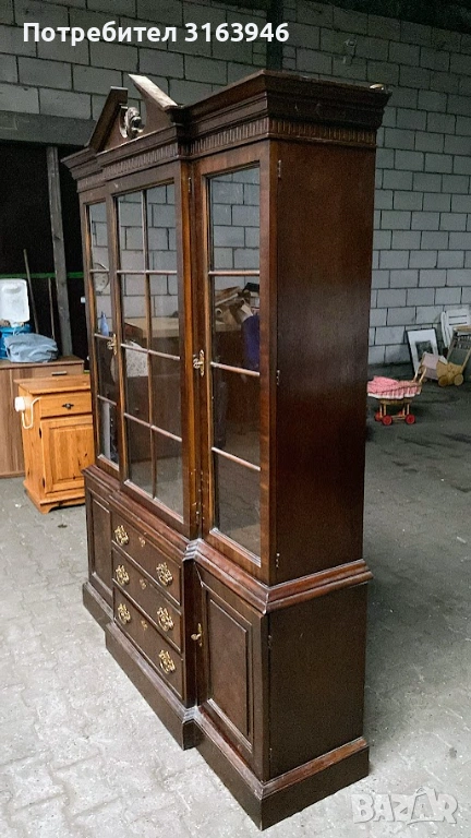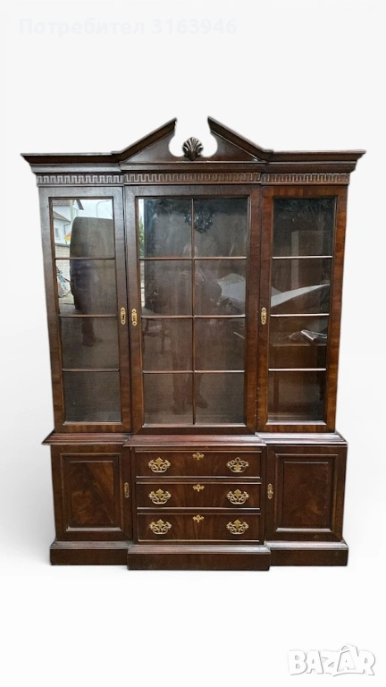 Впечатляваща американска витрина от серия Tryon на Drexel Heritage, изработена от масивно дърво с тъмен, благороден финиш. Горната част е с остъклени врати с дървени шпроси, подходящи за порцелан, кристал или колекционерски предмети. Долната част разполага с чекмеджета и затворени шкафове, осигуряващи практично пространство за съхранение. Богато декорирани месингови дръжки и класически корниз придават изискан, представителен вид.