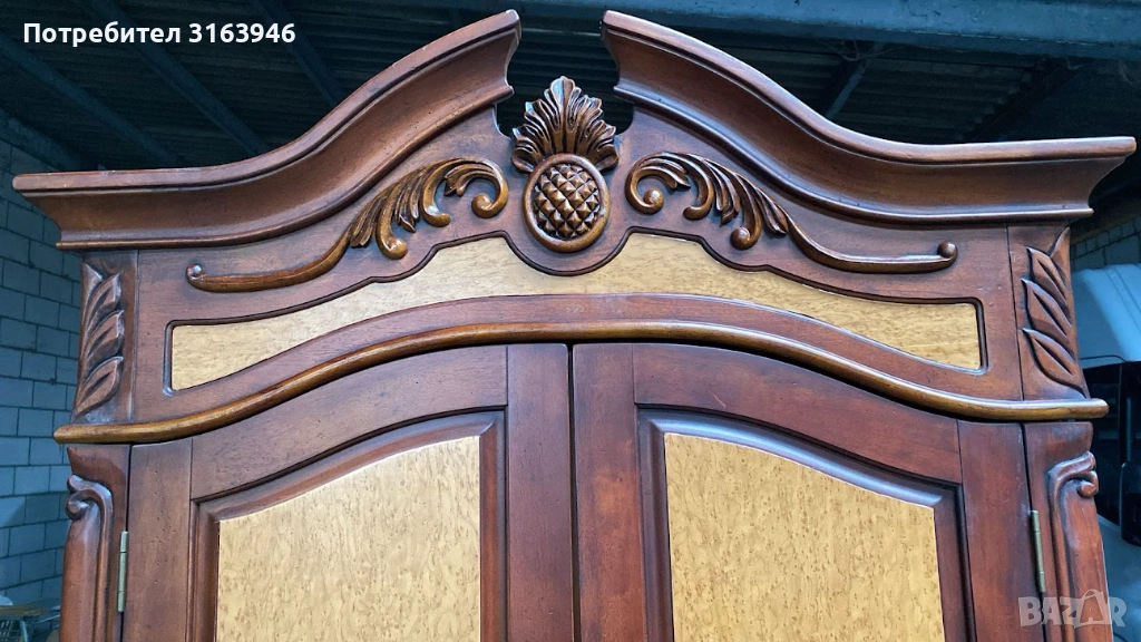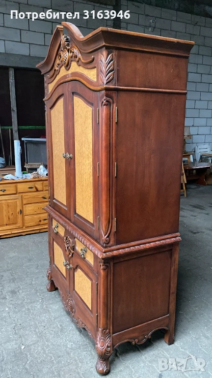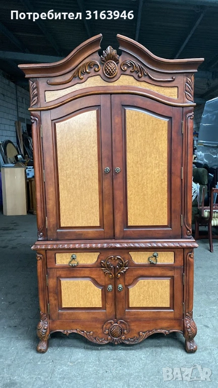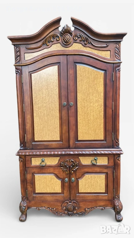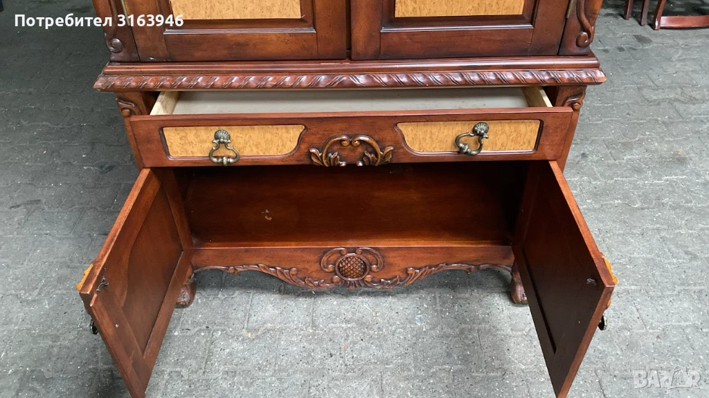 Впечатляващ шкаф от масивно дърво с богата декоративна резба и класическа симетрична композиция. Горната част е с двукрили врати и вътрешно пространство, подходящо за съхранение или експозиция (възможно използване като бар/витрина). Долната част разполага с чекмеджета и затворен шкаф, осигуряващи практично място за съхранение. Изящните детайли, орнаментите и извитите крака придават луксозна и представителна визия.