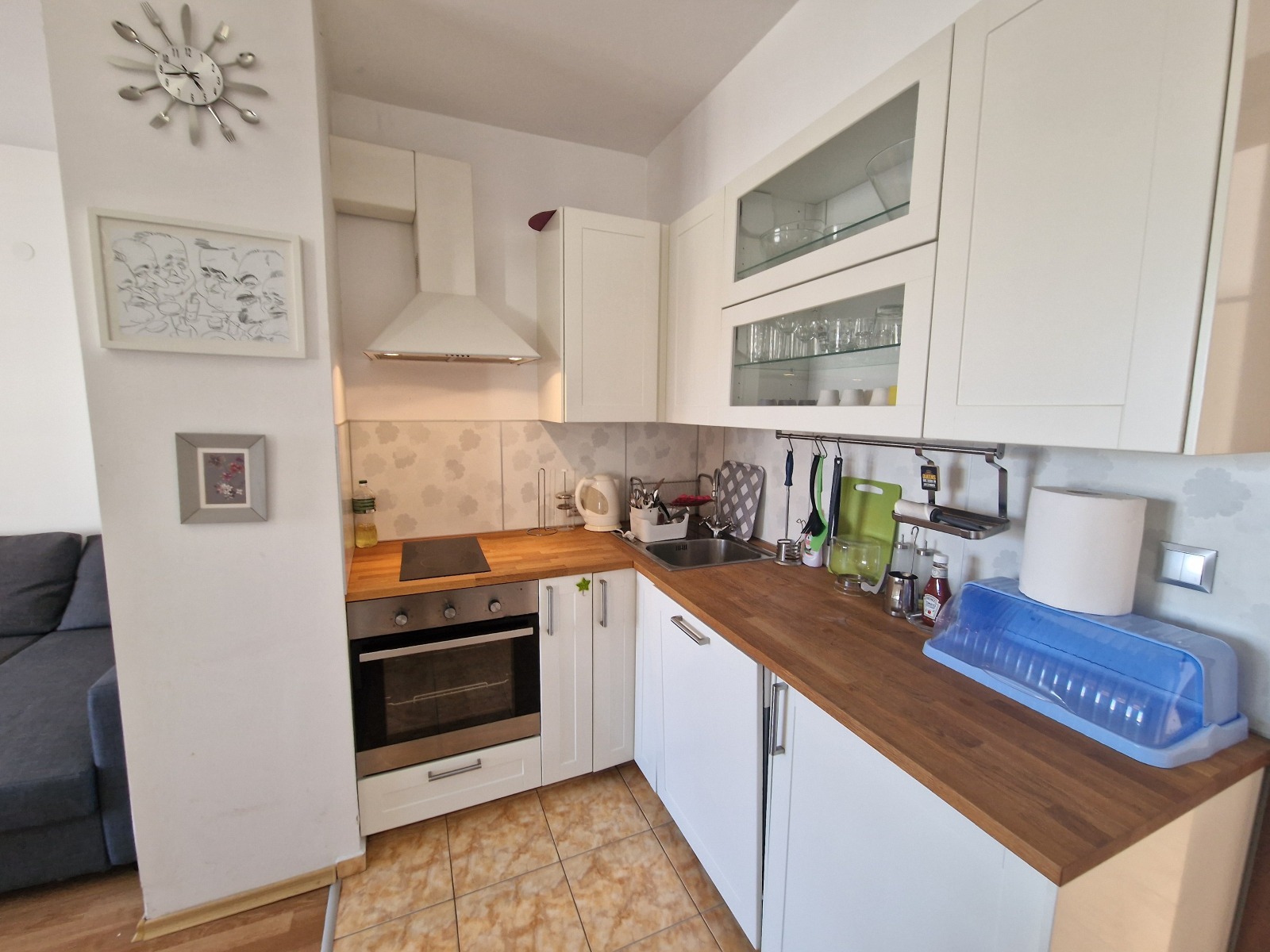 Жилището се състои от просторно входно антре, което води към светла всекидневна с трапезария и модерен кухненски бокс. Кухнята е напълно оборудвана с фурна, керамичен котлон, абсорбатор, съдомиялна машина, хладилник, както и маса за хранене със столове.