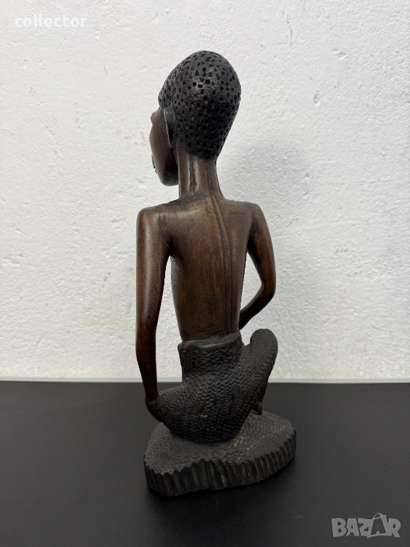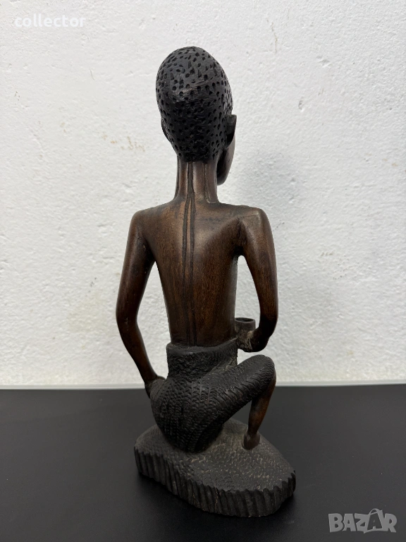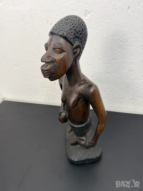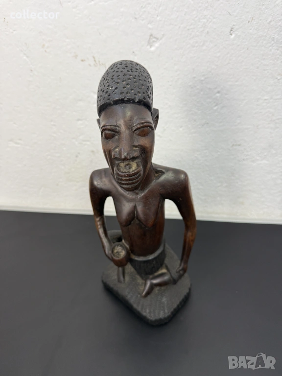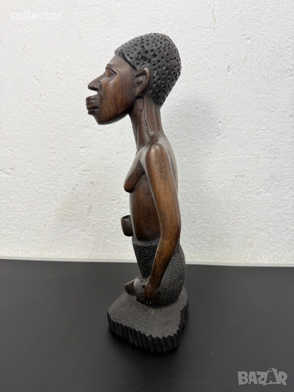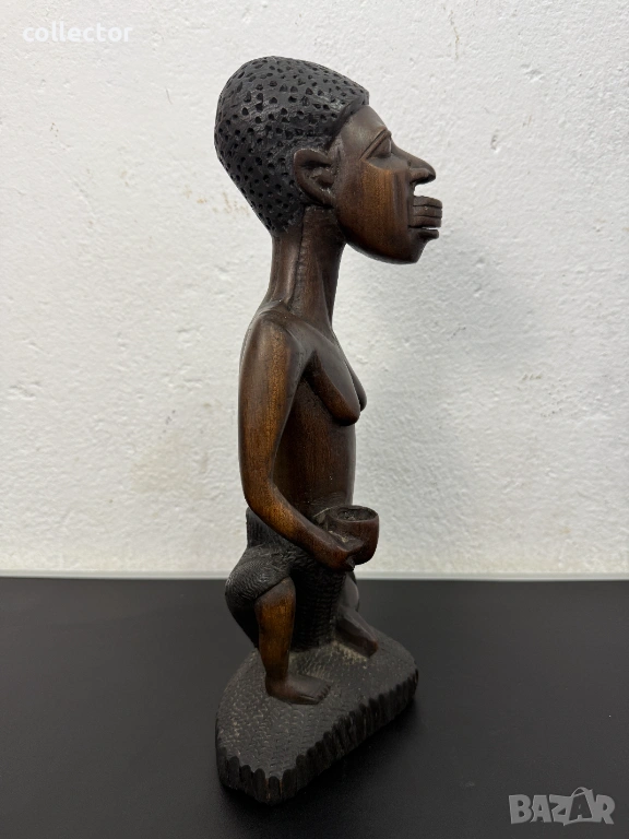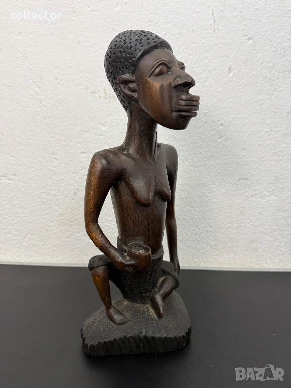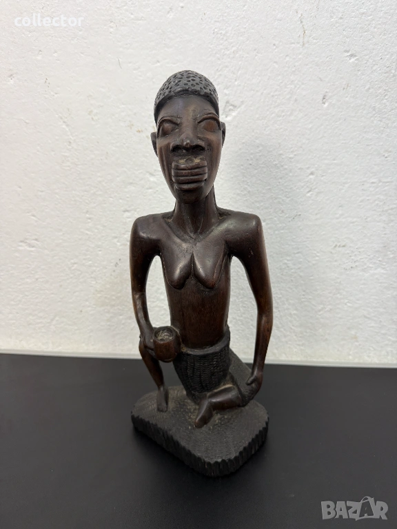 Фигурата е ръчно изработена / резбована и изобразява седнала или коленичила жена, което е символ на предците и бита. : Тъмният цвят и тежестта са типични за абаноса.