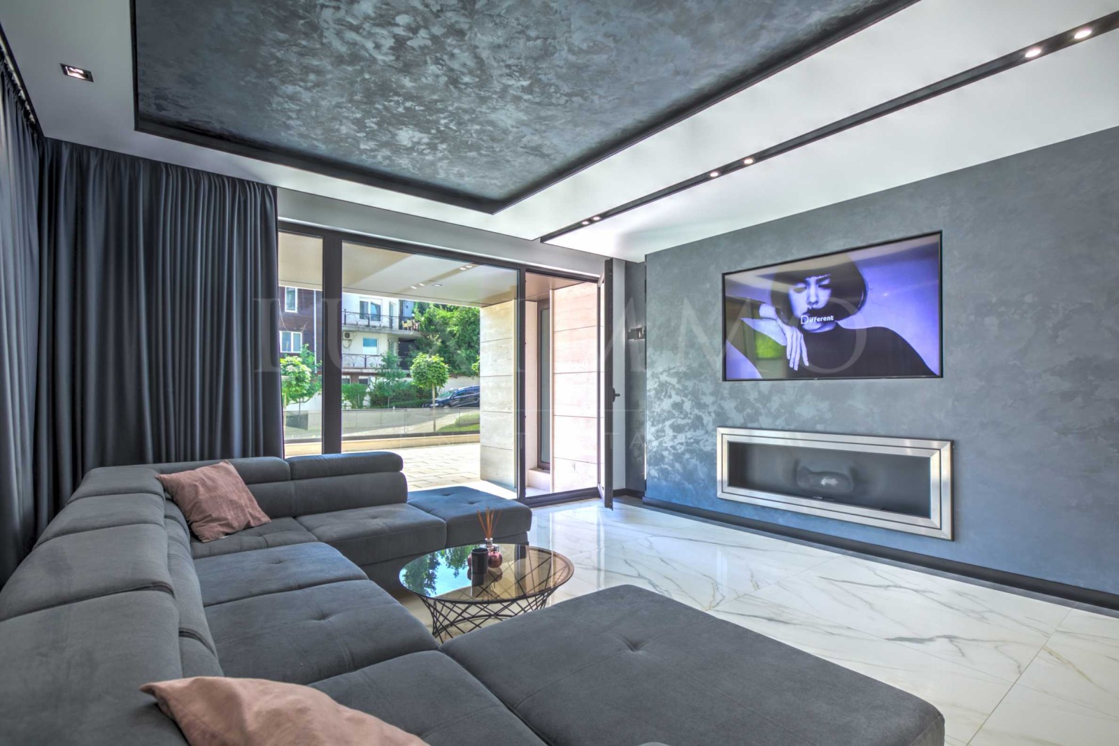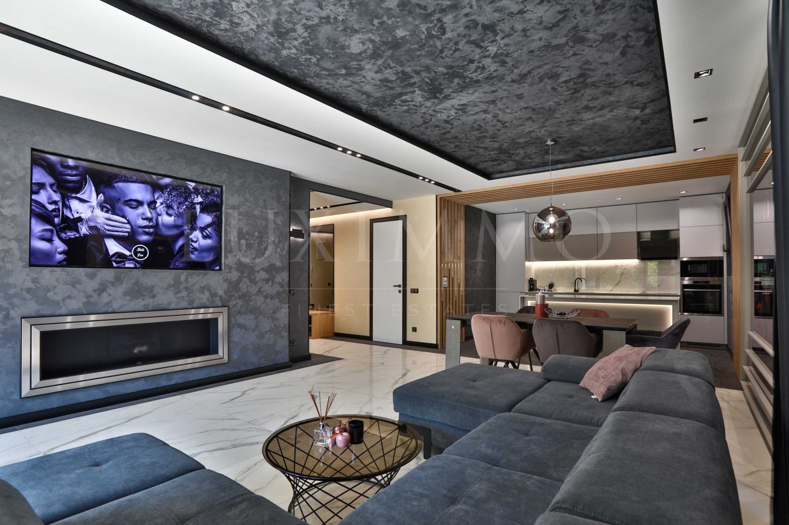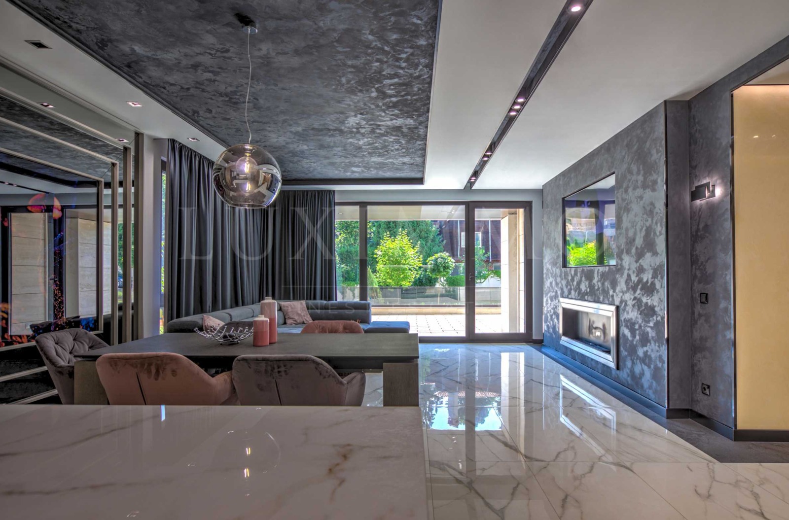 Дневна с трапезария и мека мебел широкоекранен телевизор Samsung, уютна камина на течно гориво;