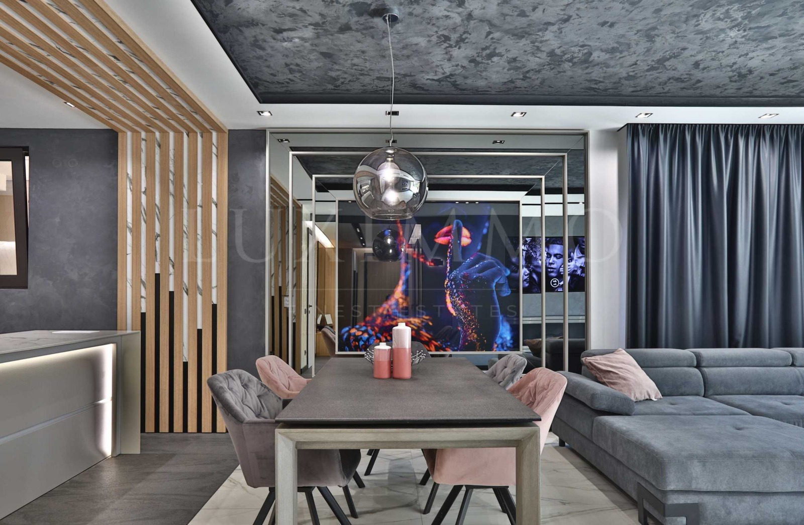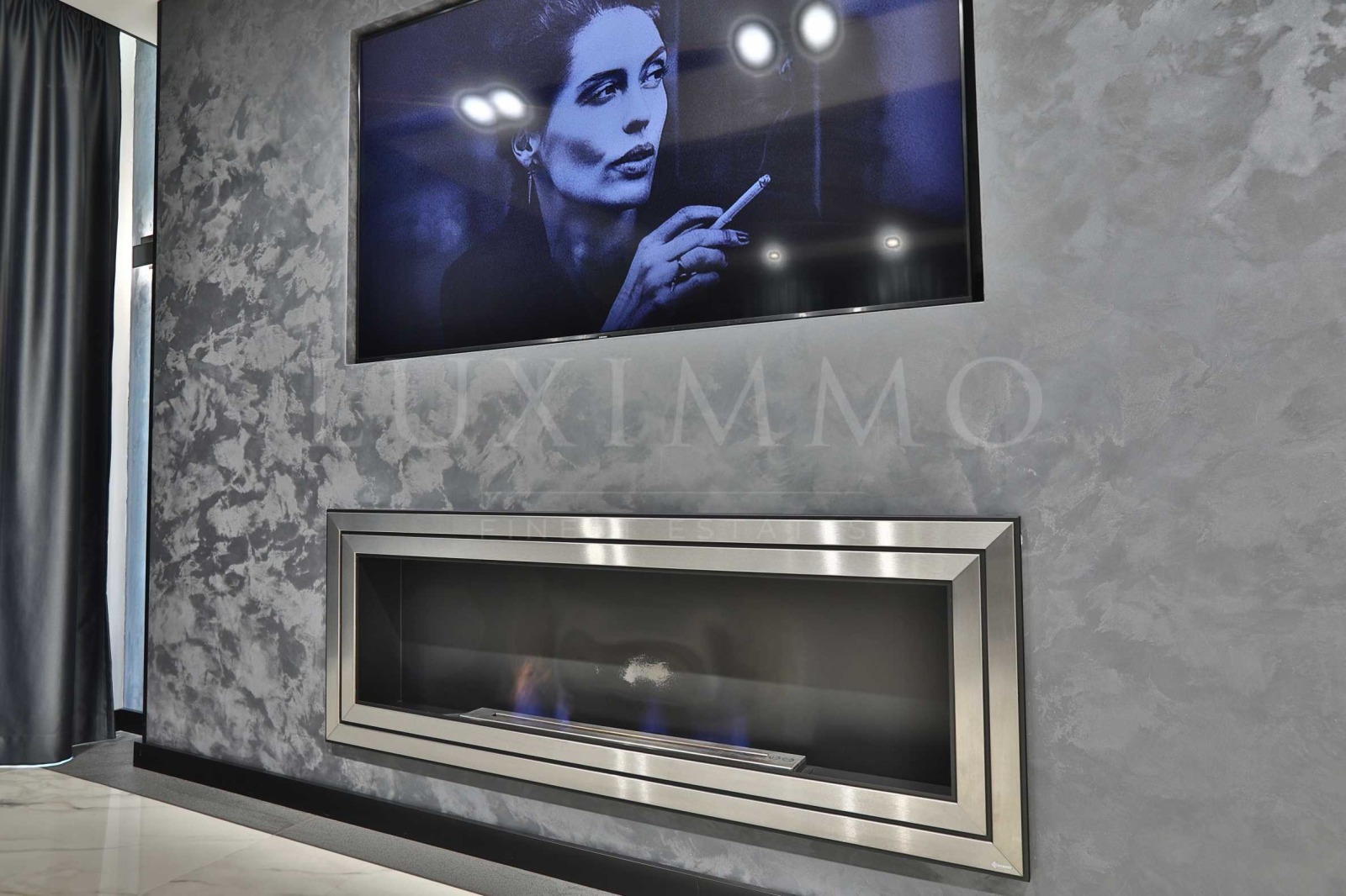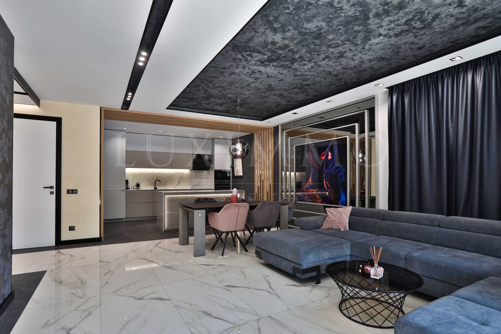 Дневна с трапезария и мека мебел широкоекранен телевизор Samsung, уютна камина на течно гориво;