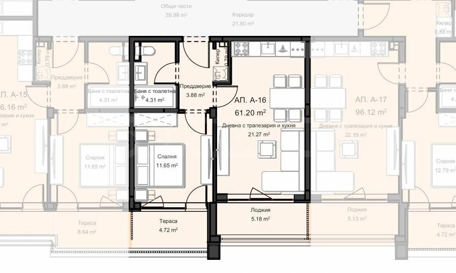 Апартаментите се предават в степен на завършеност по БДС, на шпакловка и замазка:
