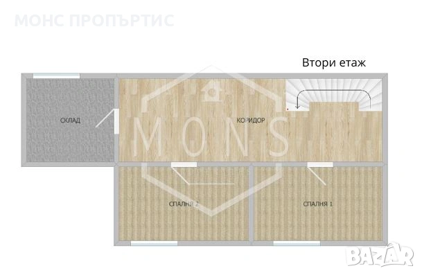 -Втори етаж: коридор, две спални, склад и таванско помещение.