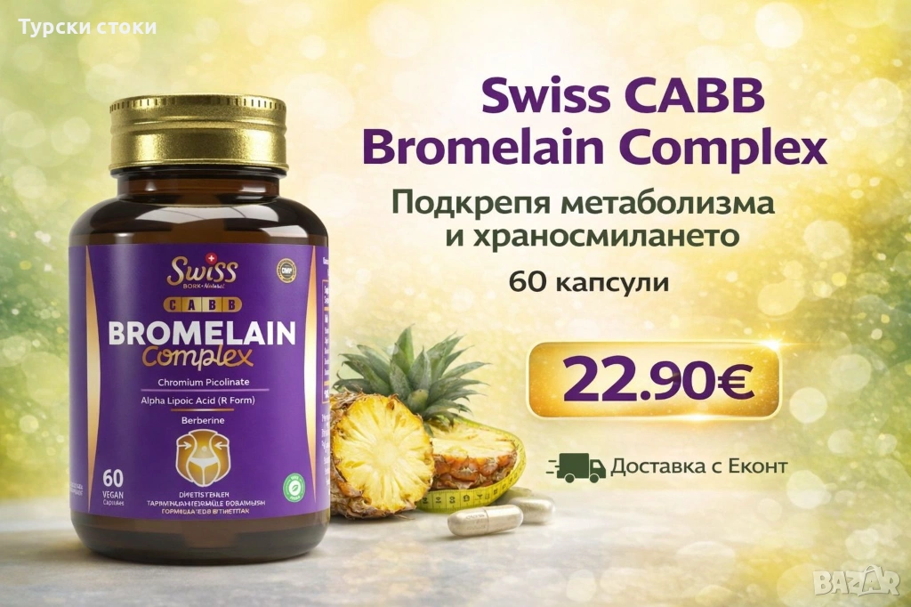 Подкрепете баланса на организма с Swiss CABB Bromelain Complex – формула, разработена с внимателно подбрани съставки за подкрепа на метаболизма и храносмилането.