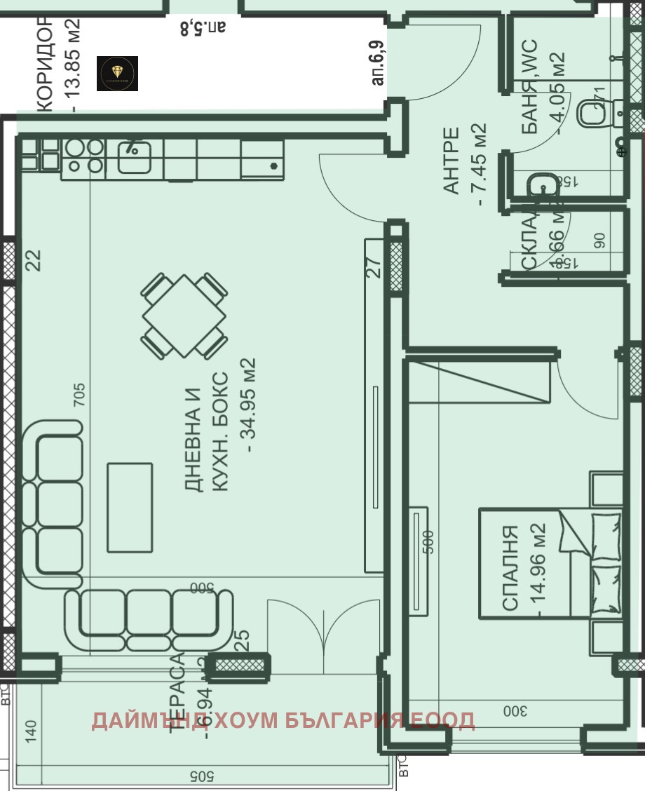 просторна дневна с кухненски бокс, спалня, баня с тоалетна, складово помещение и тераса.