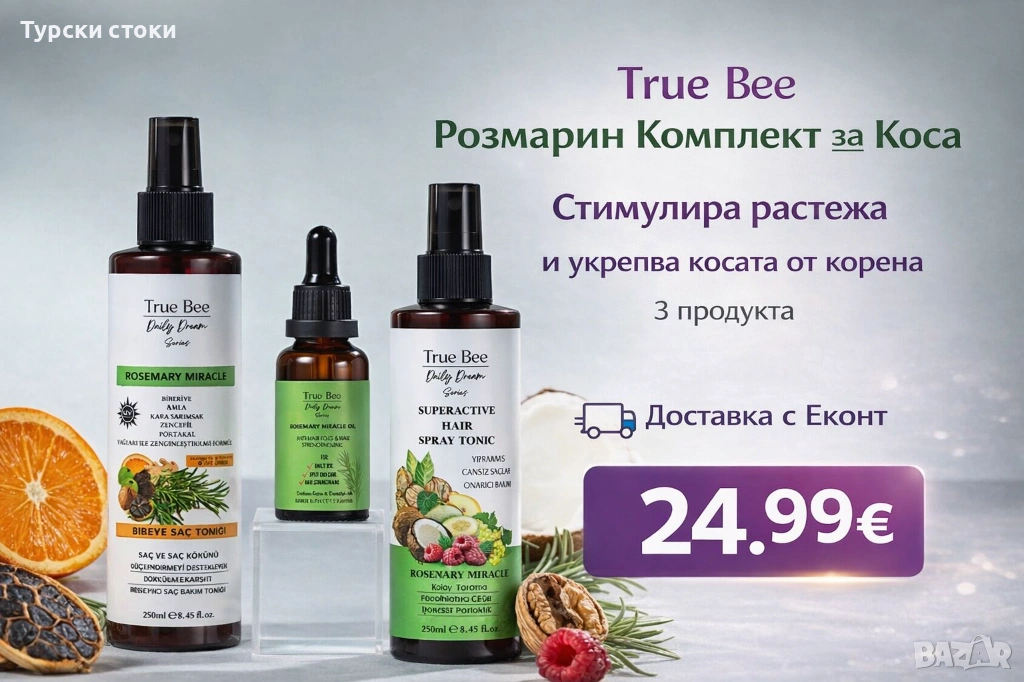 Открийте силата на натуралната грижа с True Bee Rosemary Miracle – комплект от три продукта, създадени да подпомогнат по-силна, по-гъста и жизнена коса.