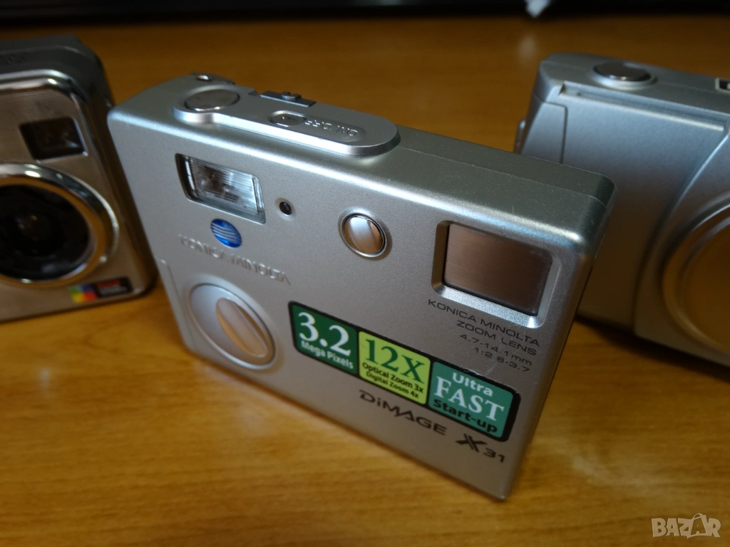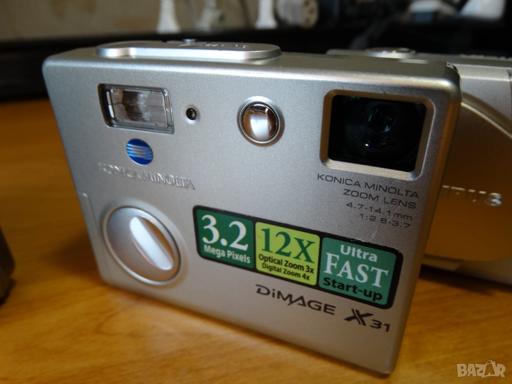 Konica Minolta Dimage X31 - метално тяло, изряден технически и почти без следи от употреба ! Апарата е с натиснат дисплей, но си работи абсолютно коректно ! Дисплеят е натиснат, а не начупен ! Използва 2 Х АА батерии и SD памет ( приложил съм 256 MB в комплекта ) !