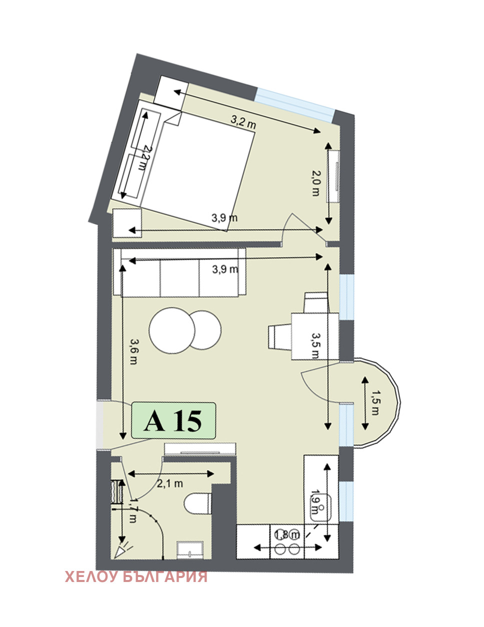 От входното антре се влиза в просторна дневна с приблизителни размери 3,6 м × 3,9 м, където е предвидена зона за отдих с диван и холна маса. Пространството позволява удобно посрещане на гости и ежедневен комфорт.
