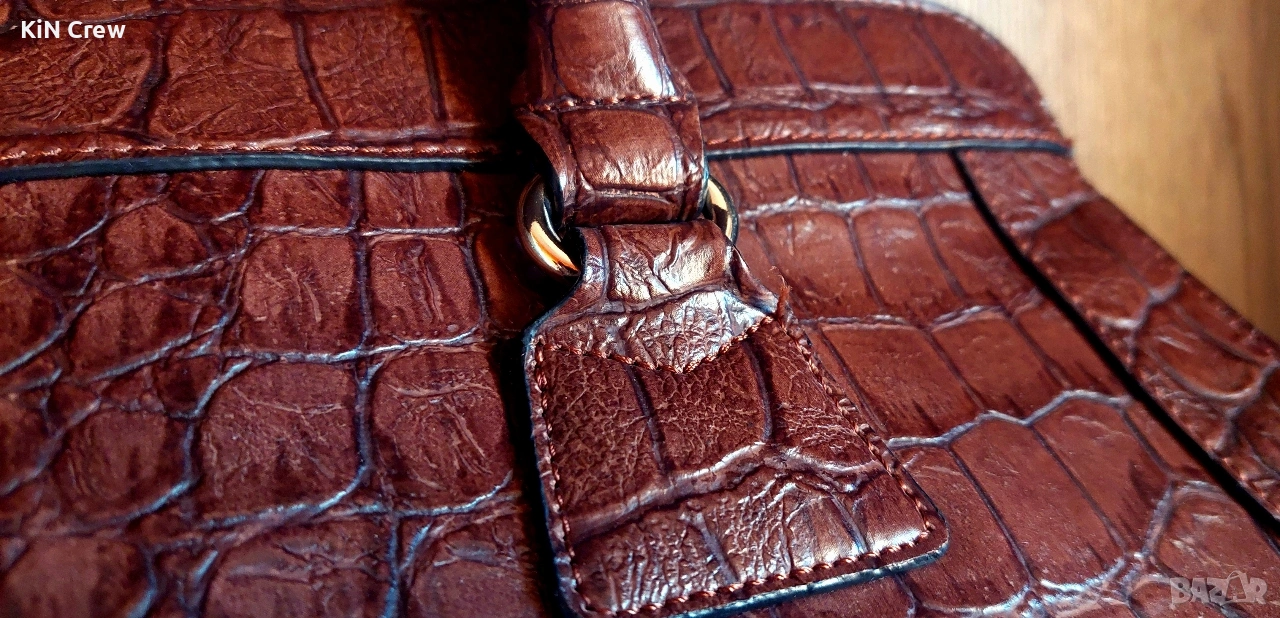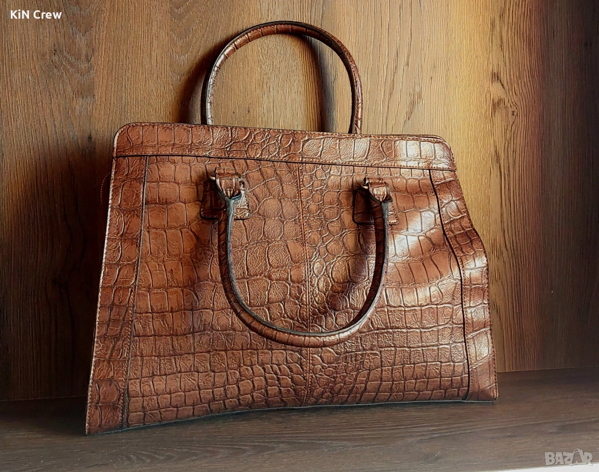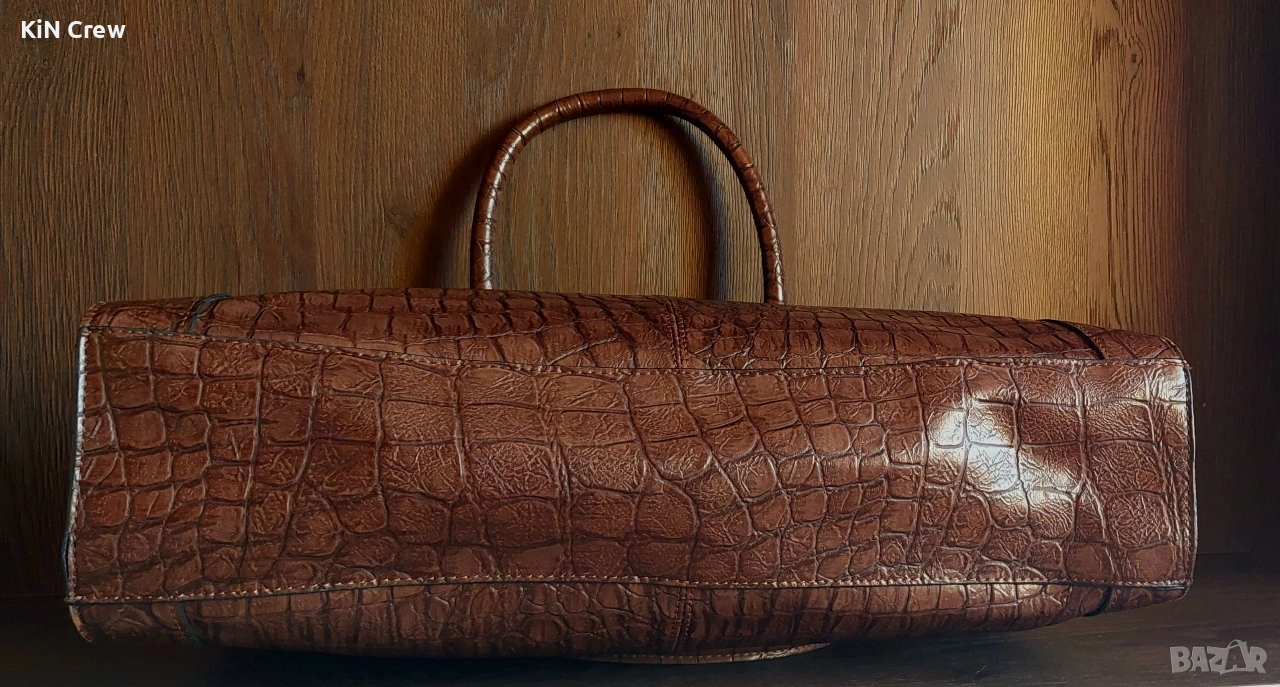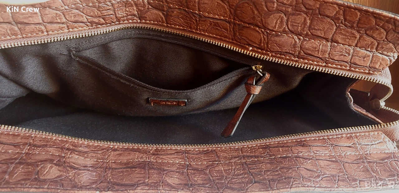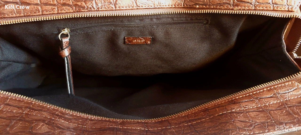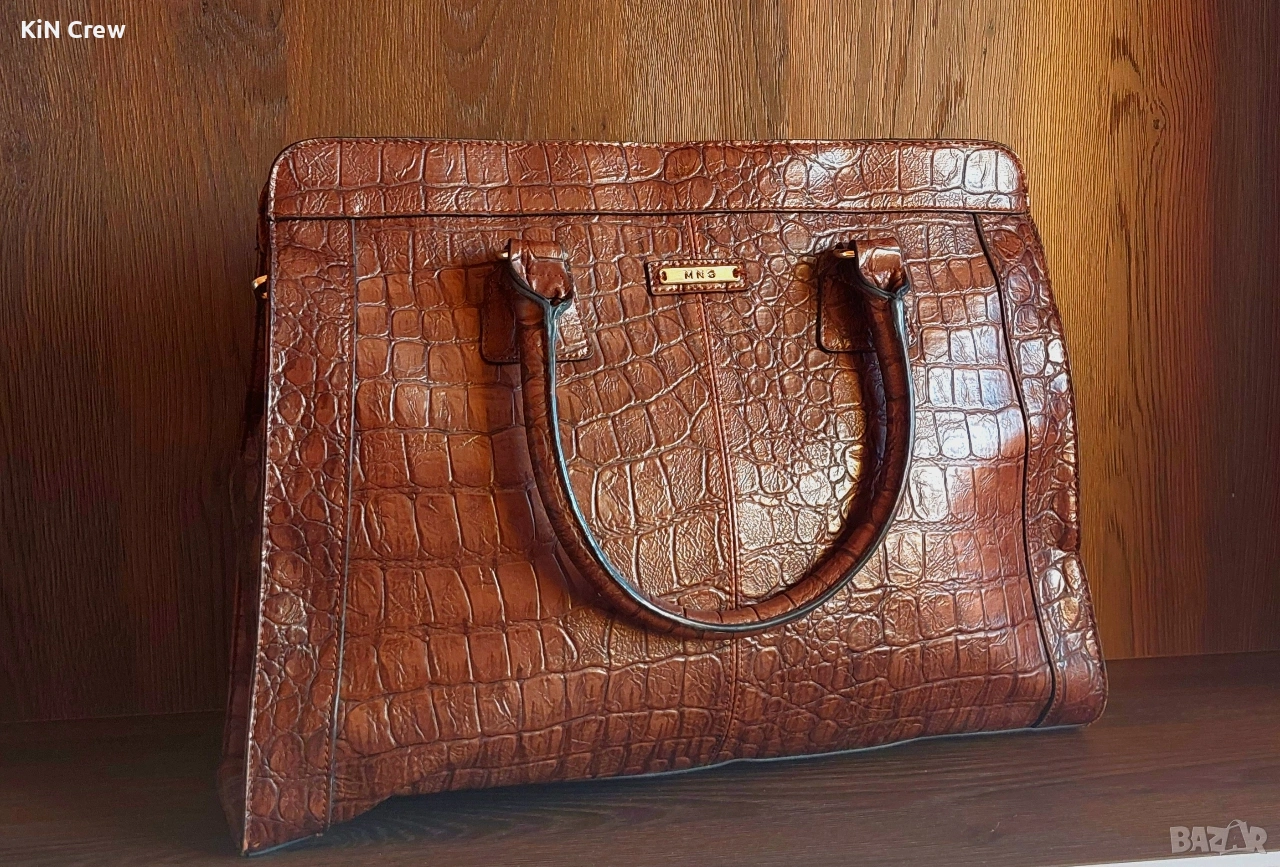 Елегантна дамска чанта MNG (Mango) в кафяв цвят с релефна текстура тип крокодил. Чантата е много стилна и практична – подходяща както за ежедневие, така и за по-официална визия или работа. Побира документи, лаптоп или лични вещи без проблем. Изработена от качествен материал с твърда структура, която запазва формата си. Дръжките са стабилни и удобни за носене. Състоянието е много добро, без следи от употреба отвътре, както и отвън. Възможно е лично предаване в София!