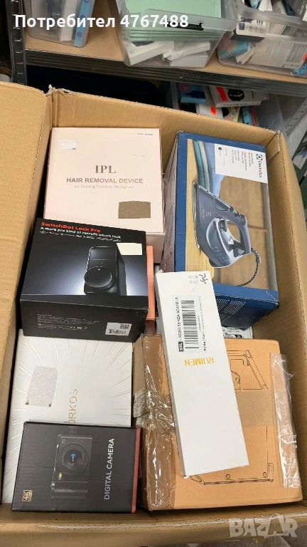Продавам кашон с различни продукти от Амазон. Стоките са разнообразни и включват електроника, аксесоари за дома, кабели, джаджи и други подобни артикули.