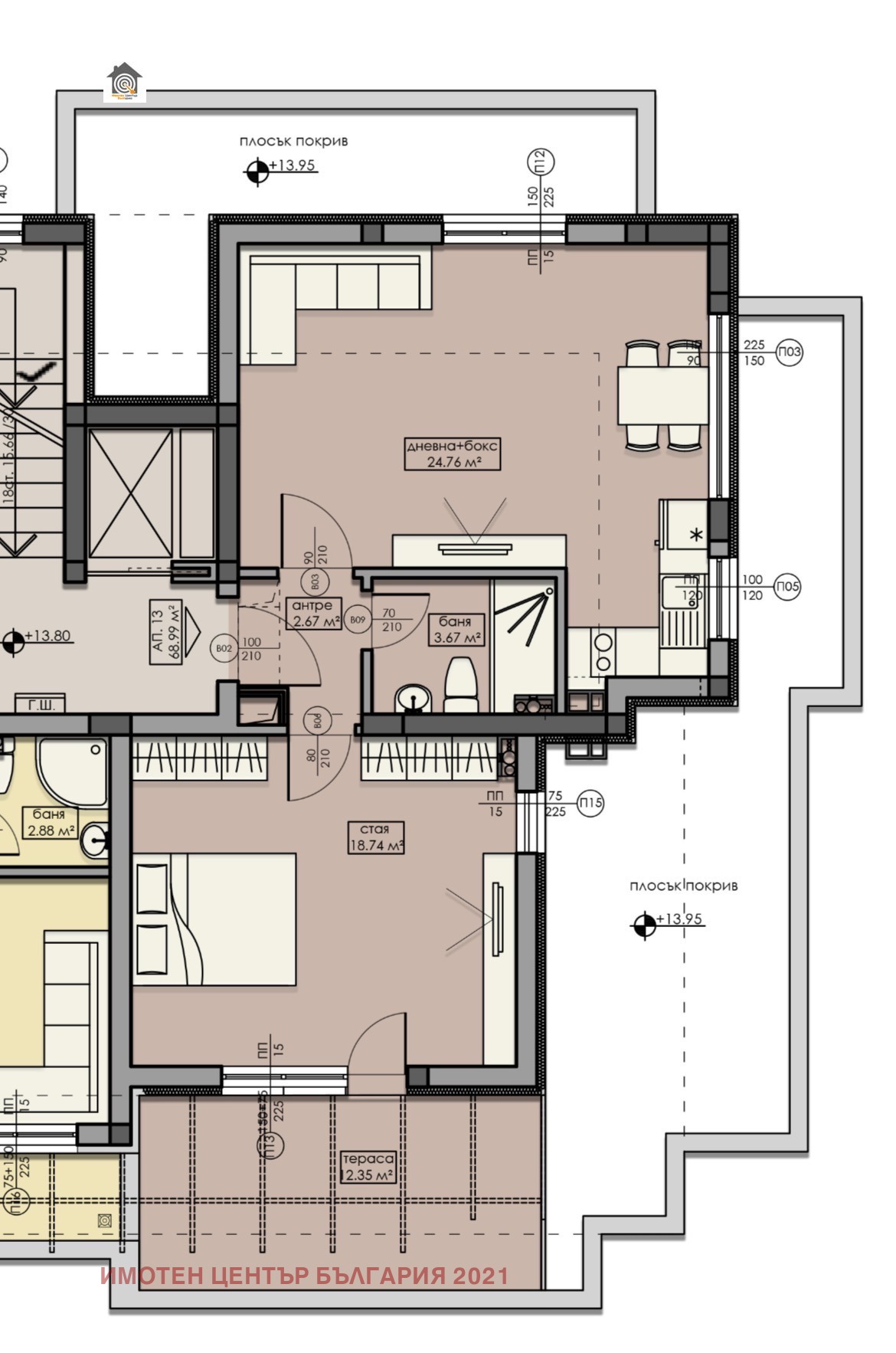 Жилището е с площ от 88 кв.м., към което има две прилежащи покривни тераси с обща площ от 40 кв.м., описани в нотариалния акт. Просторните тераси създават усещане за допълнително лично пространство и предлагат чудесна възможност за отдих на открито. На част от едната тераса е обособена зимна градина , приятно място за релакс през всички сезони.