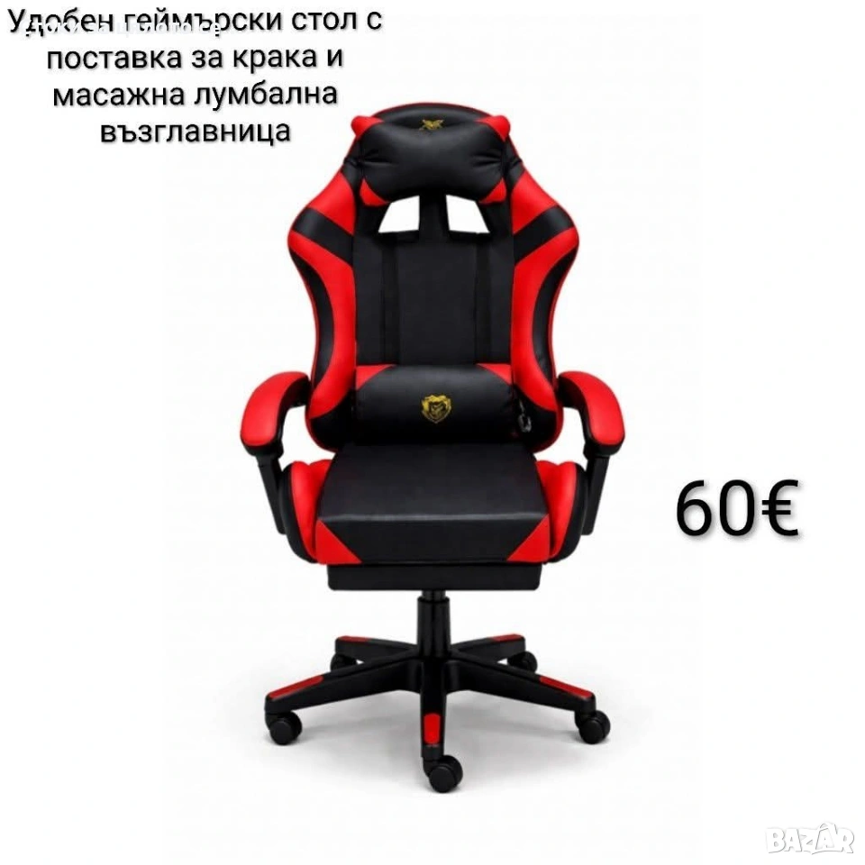 Удобен геймърски стол с поставка за крака и масажна лумбална възглавница, Черно-червен