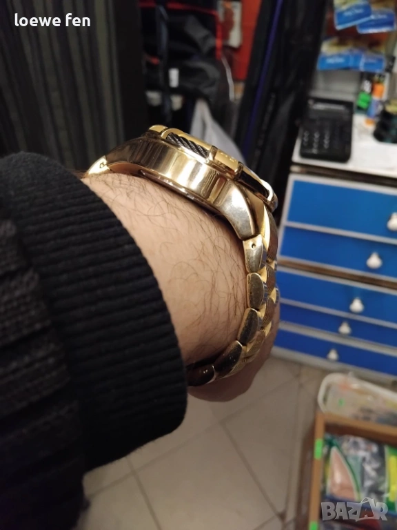 Часовникът е Нов, не е носен! Слагал съм го само за снимките! Пуснах го за продажба, защото предпочитам сребрист от този модел! Единствената забележчица е, че голямата стрелка на хронометъра при нулиране застава на 12 часа и 3 минути, както е на снимките...на мен лично това не ми пречи и няма нищо общо с продажбата на часовника! На японските механизми стрелката може да се коригира с копчетата, но на този швейцарски механизъм не знам как става...предполагам, че пак може! На японските механизми голямата стрелка е секундарник, а хронометъра са само малки стрелки, тук при швейцарския кварц е обратно, голямата стрелка е за хронометъра, а секундарника на часовника е малката стрелка горе в дясно! Веригата е широка 30 мм при часовника и 26 мм при закопчалката и е дебела около 6 мм! Стъклото е купулно! Много як часовник! Пращам клип на вайбър при желание! Цената не се коментира!