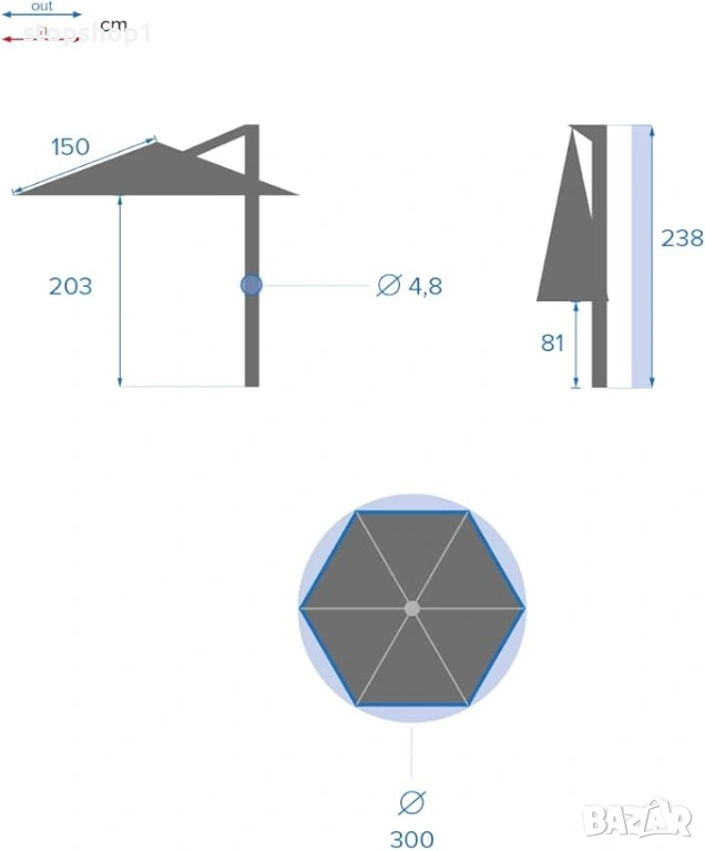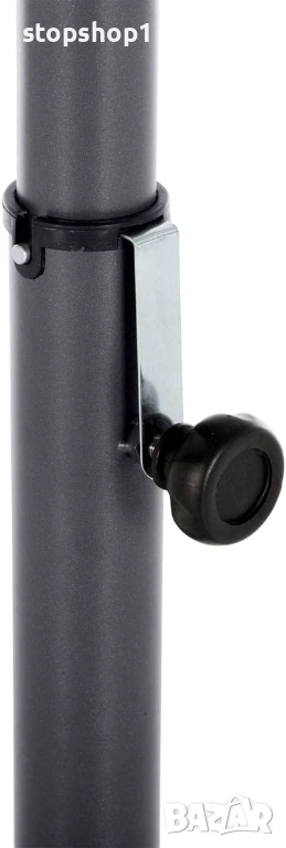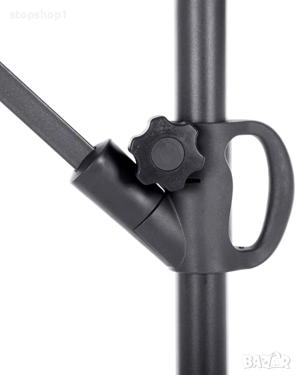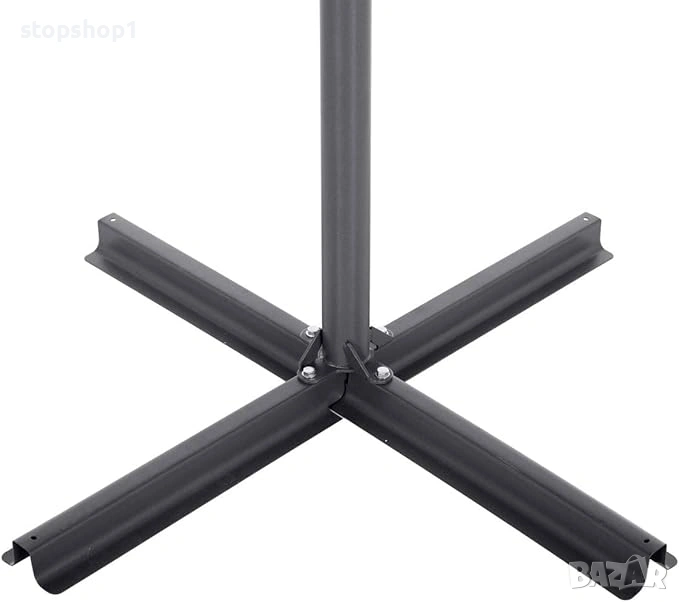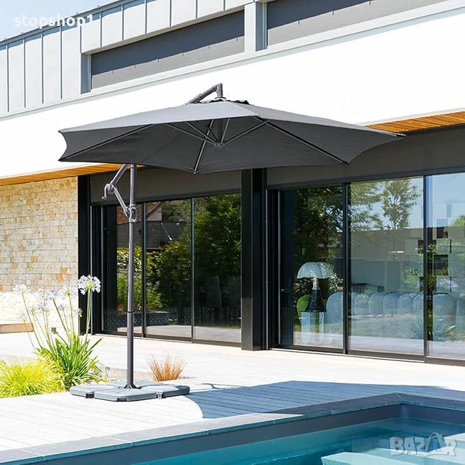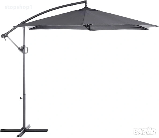 Офсетов чадър Hespéride Janeiro. Кръгъл сенник, диаметър 3 м, цвят шистово сиво. Отваря се лесно с манивела. Оборудван с кръстосана основа,. Изработен от стомана, алуминий и 200 г/м² полиестер. Диаметър 3 м. Височина 2,5 м. Тегло 13 кг.