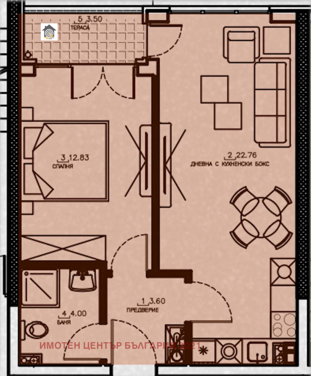 Апартаментът е разположен на първи жилищен етаж и е с функционално разпределение: входно антре, просторна всекидневна с кухненски бокс, спалня, баня с тоалетна и тераса. Големите френски прозорци осигуряват много естествена светлина и усещане за простор. Разполага с чиста площ от 53,3кв.м и обща площ 64,4кв.м, за сградата са предвидени подземни паркоместа.