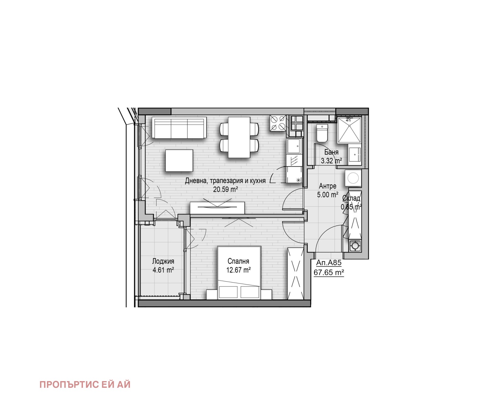 Обща площ: 67,65 кв.м