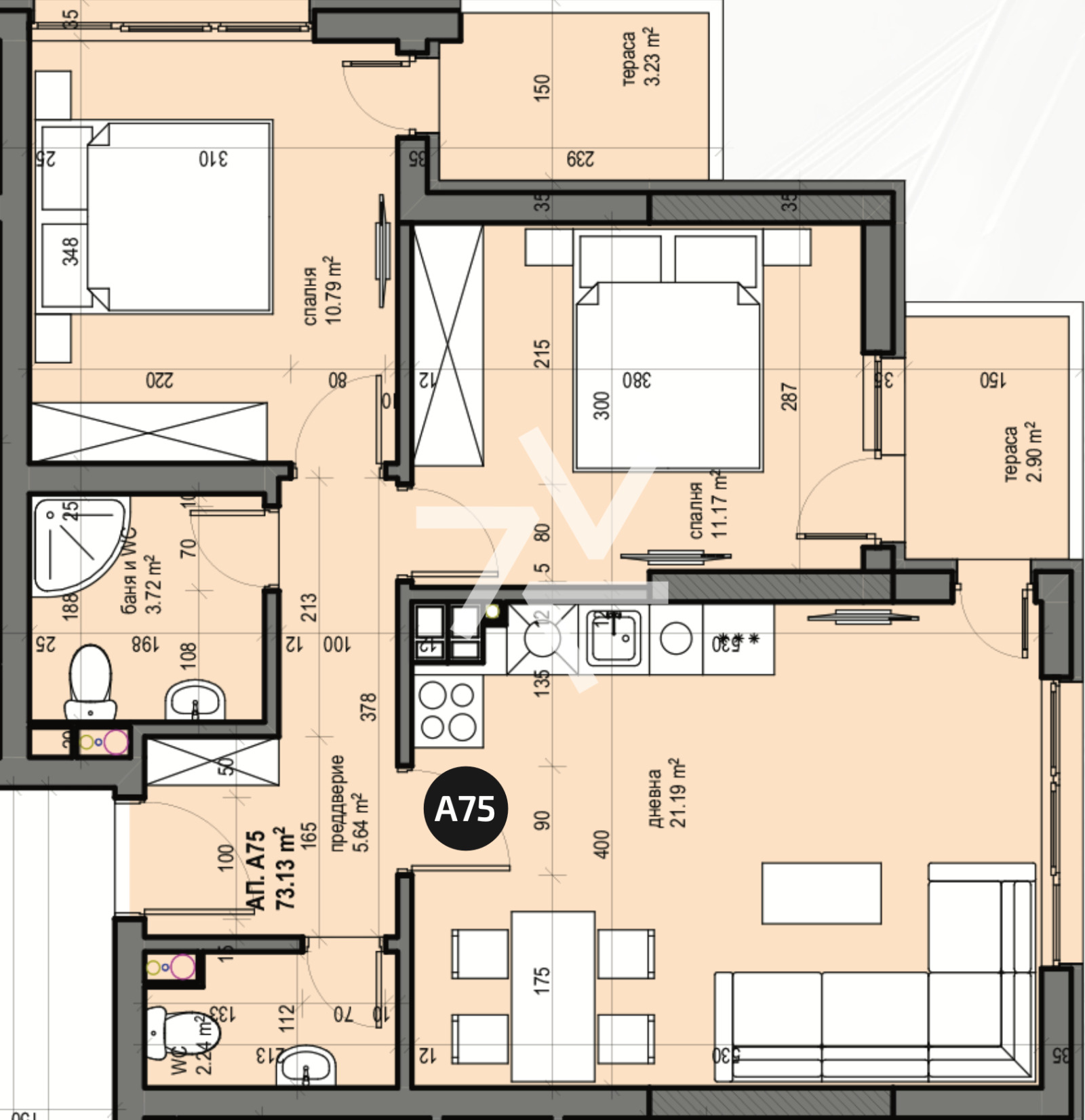 коридор, баня с тоалетна, дневна с кухненски бокс, две спални и два балкона
