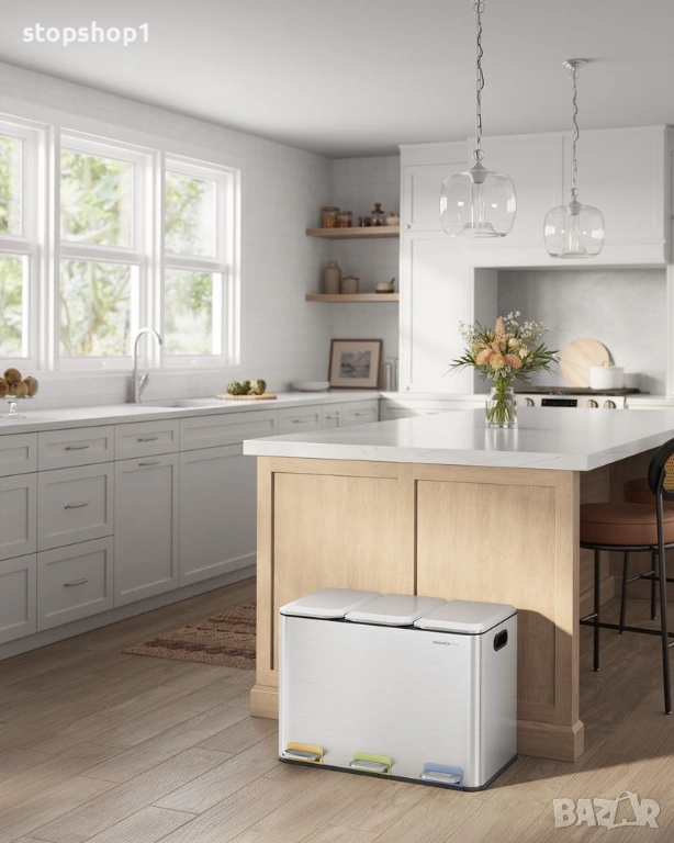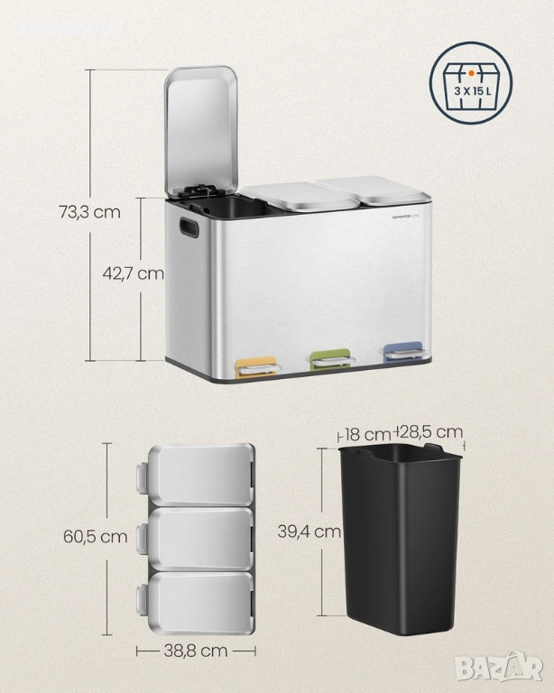 - 【БЕЗУПРЕЧНО СОРТИРАНЕ】С 3 отделения по 15 литра, този кош улеснява разделянето на рециклируеми материали, общи отпадъци и хранителни отпадъци. Насладете се на безпроблемно управление на отпадъците и рециклирането с този троен кош.