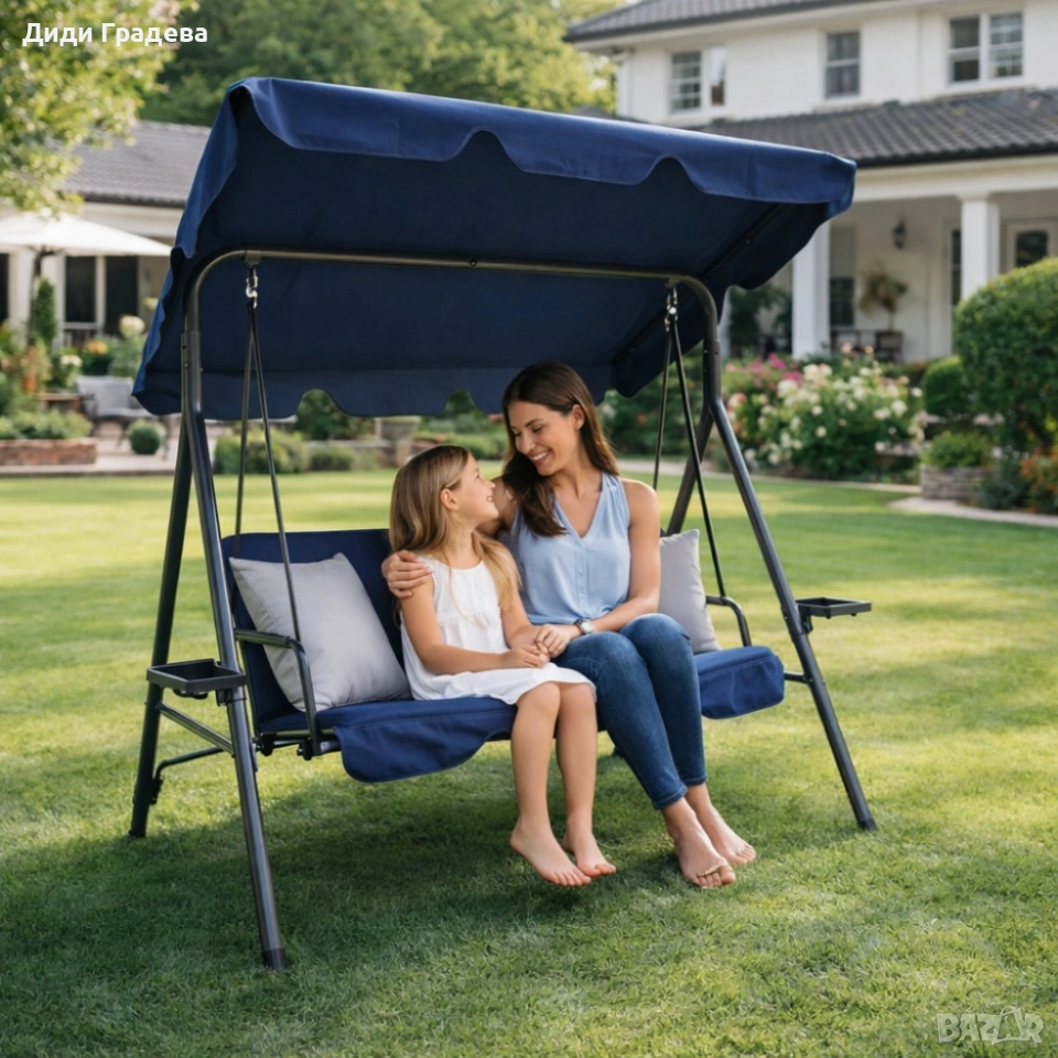 Градинска люлка A-Type със сиви възглавници и поставки за чаши - елегантност и комфорт, снимка 1 - Градински мебели, декорация  - 53860191 Градинска люлка A-Type със сиви възглавници и поставки за чаши - елегантност и комфорт, снимка 2 - Градински мебели, декорация  - 53860191 Градинска люлка A-Type със сиви възглавници и поставки за чаши - елегантност и комфорт, снимка 3 - Градински мебели, декорация  - 53860191 1/3