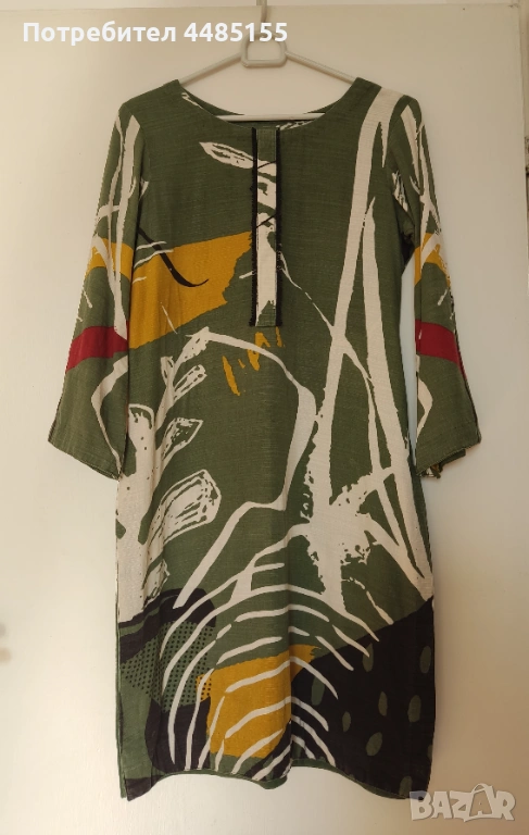 Артистична туника от памук и лен, S/M. Прав модел с обло деколте, 3/4 ръкав и цепки, дълги 40 см. от двете страни. Това е туника за езотерични практики. Може да се носи също с панталон, клин или като дреха на плажа. Материята е естествена, принтът е абстрактен.
