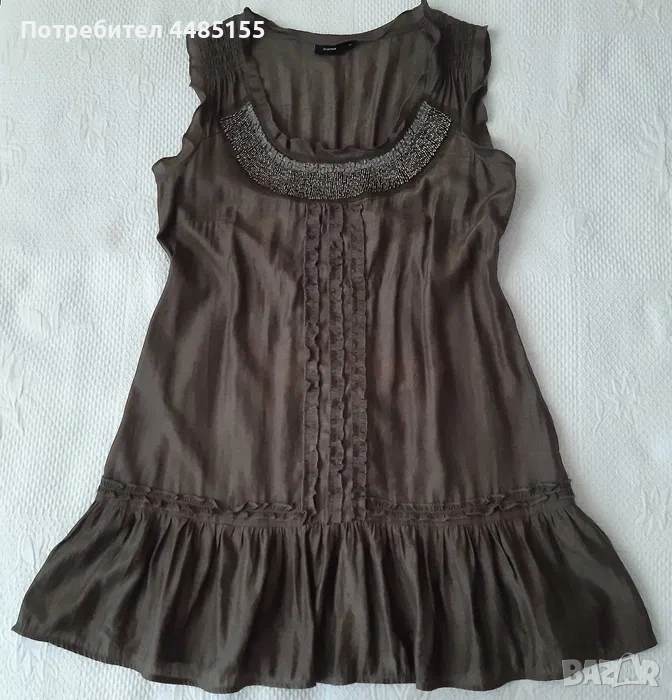 Туника fransa, 80% памук, 20% полиестер, размер М. Раздвижен модел без ръкави, декоративен ластик горе при рамената, акцент на деколтето с металносребристи и бели пайети. Цвят лъскаво масленозелено.