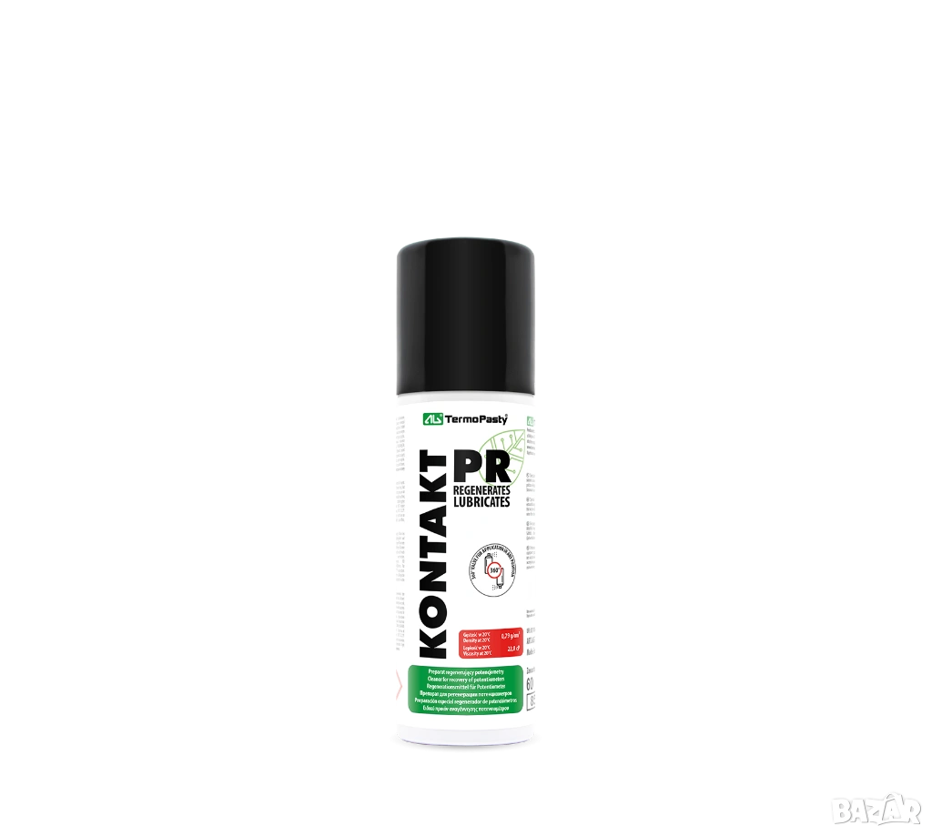 Kontakt PR е професионален продукт, разработен специално за регенерация на потенциометри. Формулиран е за възстановяване на пълната функционалност на тези прецизни компоненти чрез ефективно премахване на замърсители като сулфидни и оксидни отлагания, които се натрупват по време на работа на електронни устройства. Благодарение на усъвършенстваната си формула, той не само почиства, но и консервира, удължавайки живота на потенциометрите и подобрявайки тяхната производителност. Продуктът трябва да се прилага върху устройства, които са изключени от захранването, като се гарантира пълна безопасност.