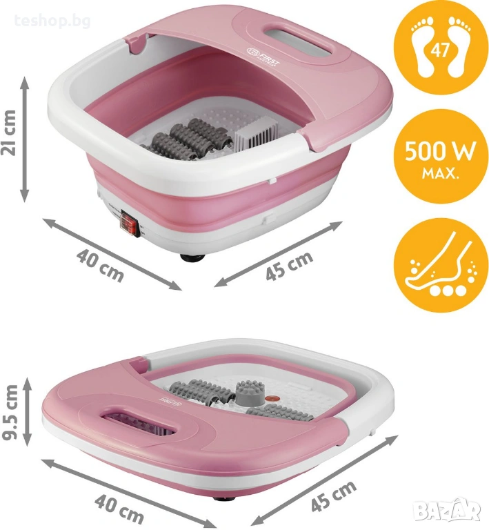 УДОБЕН ЗА УПОТРЕБА ДИЗАЙН: С шарнирен корпус и здрава дръжка, ваната за крака е лесна за транспортиране и съхранение. Гумените крачета осигуряват стабилност по време на употреба.