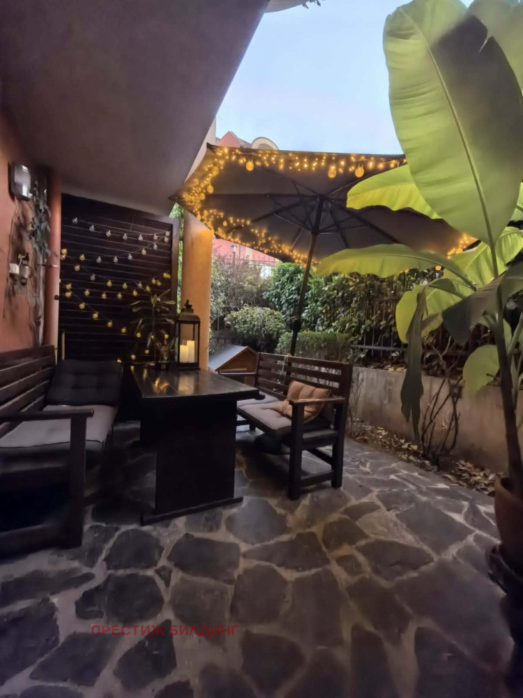 Площ 135.19 кв.м. Разположен е на партерен етаж в малка, добре поддържана и озеленена сграда. Жилището е уютно и предлага спокойствие и тишина. Състои се от просторна дневна с кухненски бокс и модерна островна част към кухнята, спалня, втора стая (гардеробна), голяма баня с тоалетна и антре. Към имота има прилежащ двор, който е 68 кв.м. Оформен е с беседка, градинска мебел и има възможност за зимна градина. Към жилището има индивидуалното паркомясто което осигурява удобство, сигурност и спокойствие за паркиране.