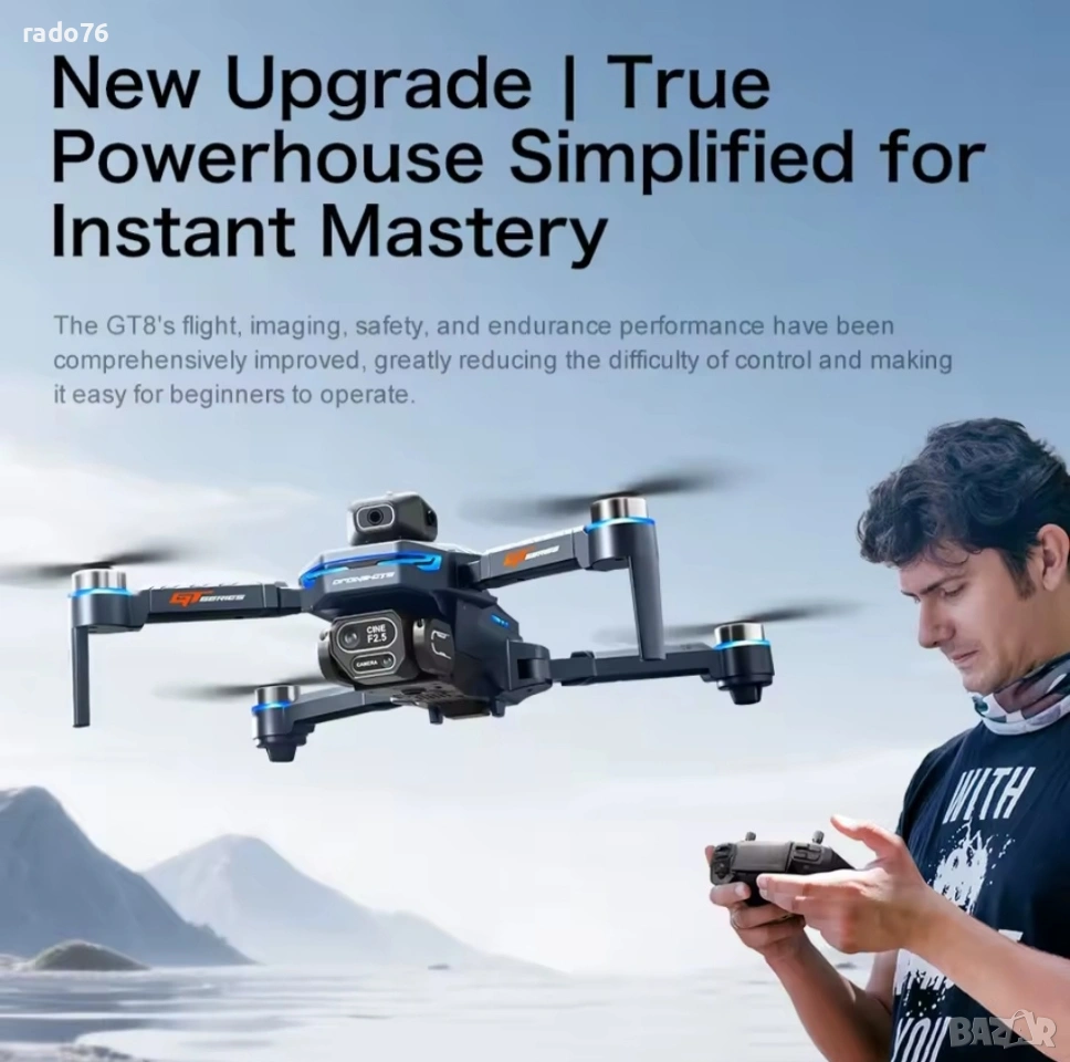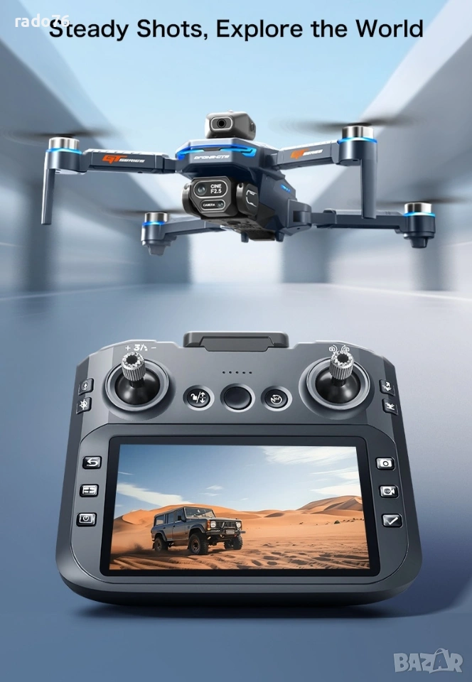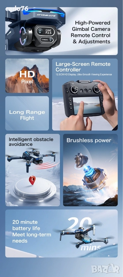 Изживейте усъвършенствана въздушна фотография с нашия 2.4G безчетков дрон с оптичен поток – идеален за ентусиасти и любители • Заснемане с висока разделителна способност: Оборудван с 4K широкоъгълна WIFI камера на предния обектив – безпроблемно превключвайте ъглите нагоре и надолу за динамични въздушни снимки. Разполага с усъвършенствана електронна стабилизация на изображението (EIS), за да осигури кристално ясни снимки и стабилни HD видеоклипове дори при ветровити условия. Заснемайте зашеметяващи пейзажи, ярки сцени и запомнящи се моменти отгоре с професионална яснота. • Интелигентни режими на полет: Включва режим на задържане на височина, позициониране на оптичен поток и технология за задържане във фиксирана точка – осигурявайки стабилно и безпроблемно летене. Идеален за начинаещи и опитни пилоти, търсещи плавни и надеждни полети за фотография или ежедневно летене. • Удължено време на полет и наблюдение в реално време: Захранва се от литиева батерия с висок капацитет 3.7V 1300mAh – предлага приблизително 20 минути непрекъснат полет. Вграденият LCD дисплей за захранване на дистанционното управление помага за наблюдение на състоянието на батерията с един поглед, като гарантира, че никога няма да загубите контрол по време на полет.• Персонализируеми полетни траектории: Начертайте желания маршрут директно в мобилното приложение — дронът ще следва проектирания от вас път за креативна въздушна видеозаснемане или структурирани инспекции. Идеален за заснемане на сложни сцени, проследяване на движещи се обекти или изследване на труднодостъпни места.• Лесен за потребителя контрол и функции чрез приложението: Пълен контрол чрез мобилното приложение – включва режим без глава, 3D обръщания, задържане на височина и многопосочно летене (нагоре/надолу/напред/назад/наляво/надясно). Насладете се на интуитивна работа, подходяща за всички нива на умения, с бързо реагиращи контроли.• Прецизност на жестовете и оптичния поток: Разширеното разпознаване на жестове позволява лесно заснемане на снимки с прости ръчни сигнали. Оптичното позициониране на потока осигурява стабилно зависване на закрито и на открито, поддържайки прецизно позициониране дори в среди с компрометиран GPS.• Мощни и издръжливи безчеткови двигатели: Оборудвани с високопроизводителни безчеткови двигатели — осигуряващи по-голяма мощност, по-тиха работа и по-дълъг експлоатационен живот. Осигурява стабилен полет, ефективно използване на енергия и повишена издръжливост с течение на времето.• Лек и преносим дизайн: Тегло само 177 грама – достатъчно лек, за да се избегнат строгите национални разпоредби за регистрация на дронове, което го прави идеален за пътуване, приключения на открито или ежедневна употреба. Не се изискват проблеми със сертифицирането в повечето региони.• Технология против смущения и стабилност: Разполага с 2.4GHz технология против смущения и шестосен жироскоп за по-плавни и стабилни полети и прецизен контрол. Идеален за заснемане на висококачествени изображения и видеоклипове, независимо от условията на околната среда. Комплектът включва:- 1 x Високопроизводителен квадрокоптер с HD камера- 1 x Ергономично дистанционно управление- 1 x 3.7V 1300mAh акумулаторна батерия - 8 резервни перки за продължителни полети - 1 USB кабел за зареждане за удобно презареждане - 1 отвер