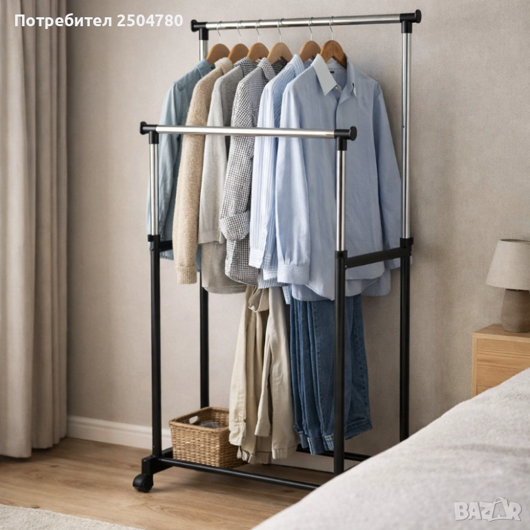 Двойна стойка за дрехи на колела - лесно преместване и повече място за дрехи, снимка 1 - Други - 53860981 Двойна стойка за дрехи на колела - лесно преместване и повече място за дрехи, снимка 2 - Други - 53860981 Двойна стойка за дрехи на колела - лесно преместване и повече място за дрехи, снимка 3 - Други - 53860981 1/3