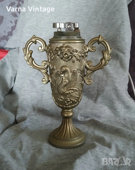 Красива винтидж запалка за бюро. липсващ кремък, не се е пълнил с газ. Височина: 18 см. Размах на подлакътниците: 14 см. Изглежда, че е изработена от калай. Но може и да греша. изображенията включват птици, рози и флорален мотив. Би била чудесно допълнение към колекция. И много други. Би изглеждала страхотно в офис на ръководител.