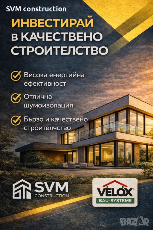 Фирма SVM Construction предлага професионално строителство на къщи и сгради. Работим с модерни строителни системи и качествени материали, като се стремим към здравина, енергийна ефективност и дълготрайност на всяка конструкция.