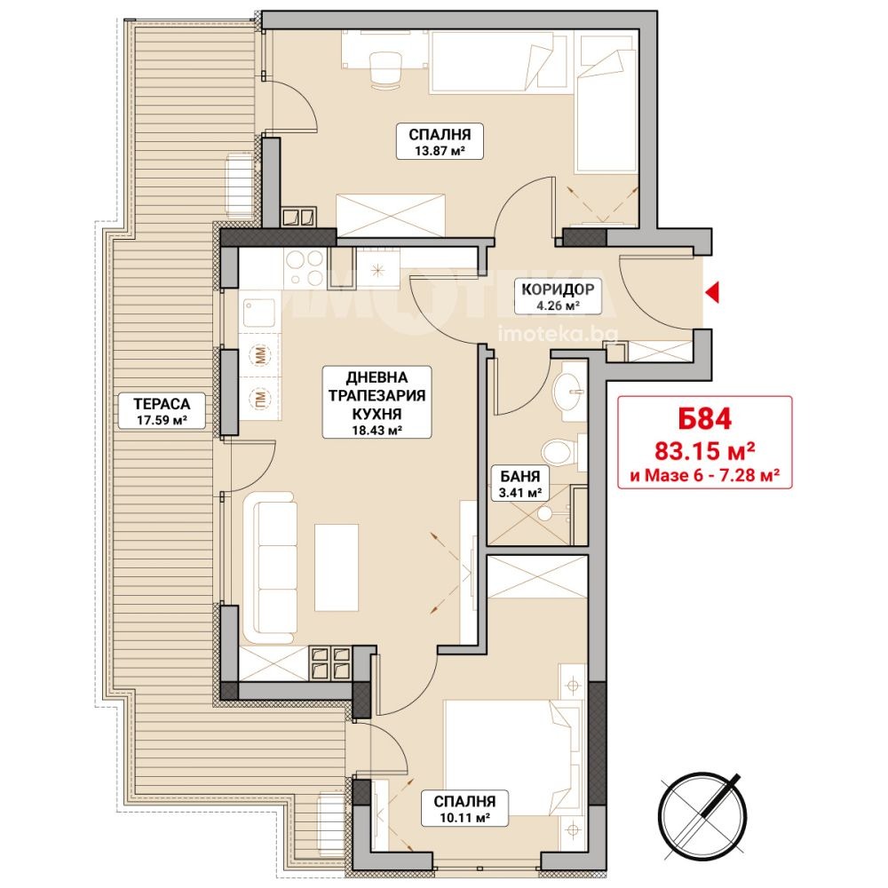 126 Апартамента, магазини, кафе-аперетив, две подземни нива с гаражи и паркоместа. Светъл тристаен апартамент със следното разпределение: две спални, всекидневна с кухненски бокс, баня, складово помещение, панорамна тераса. Три изложения - юг, изток и запад. Функционално добре организиран, разположен на реален осми етаж в новострояща се жилищна сграда от висок клас. Очакван Акт 16! 2026г.
