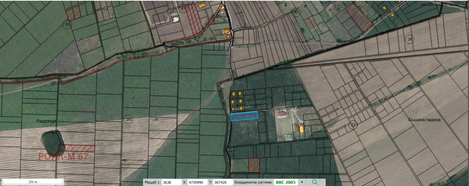 Роял-М продава земеделска земя с лице на път в съседство с нови къщи. Подходяща за преотреждане с възможност за строеж на две или повече къщи. Продават се и други земеделски земи в района.