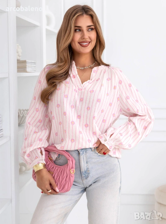 Ефирният муселин и нежният флорален мотив придават на ризата свеж и перфектен вид за пролетен стил.
